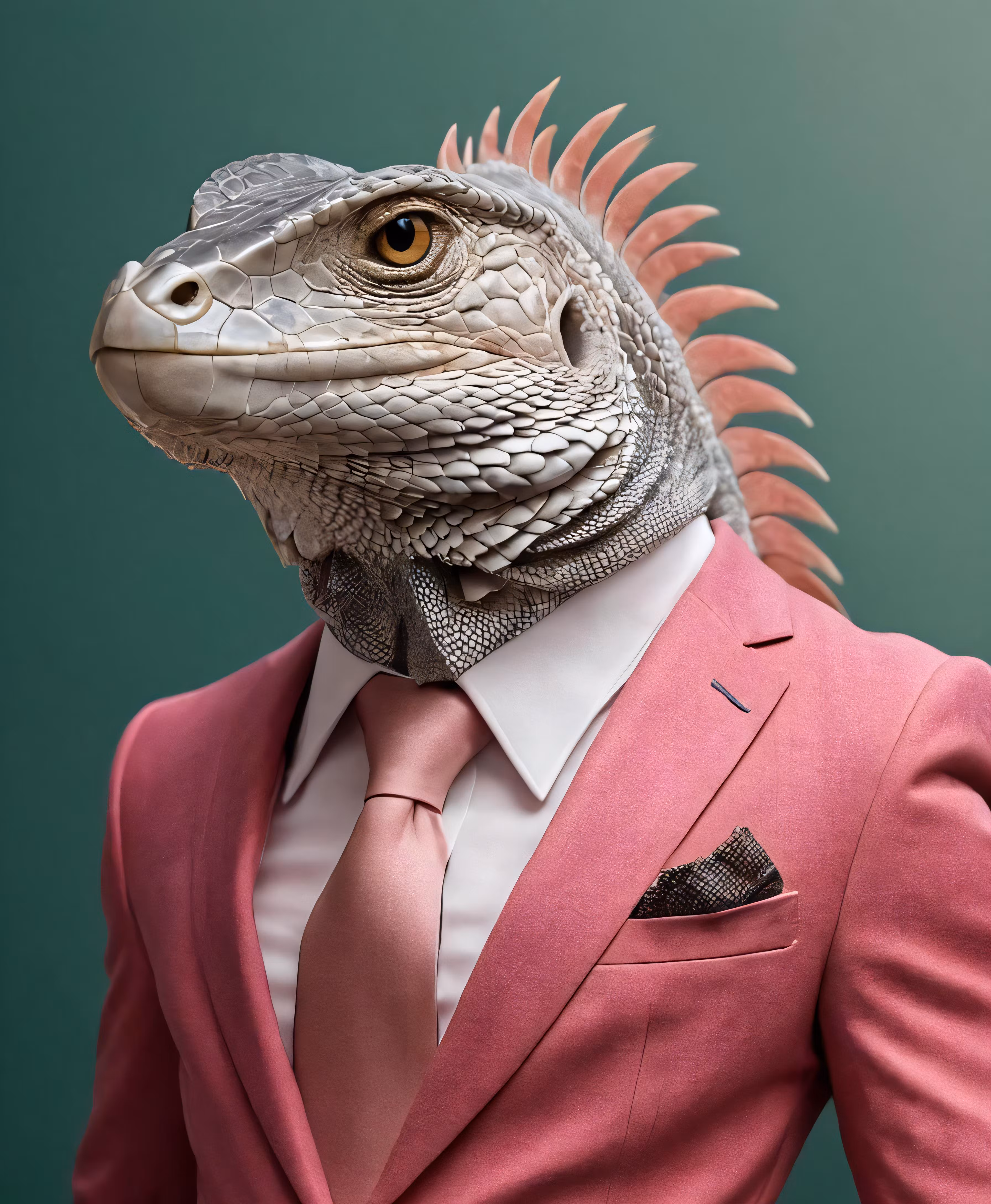 High resolution picture, free to use, an iguant wearing a pink suit with his head tucked under the collar