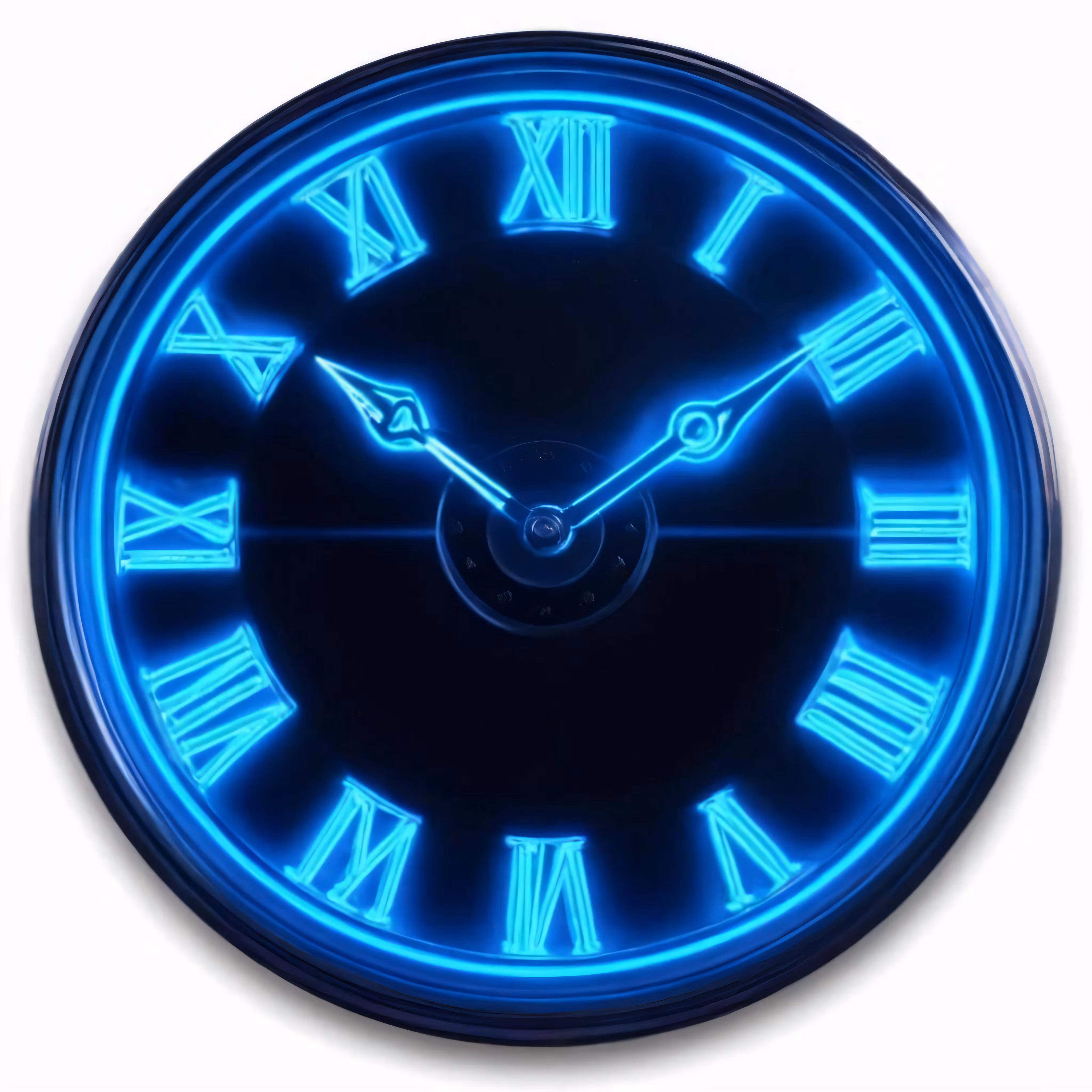 High resolution picture, free to use, an illuminated clock with roman numerals and blue lights