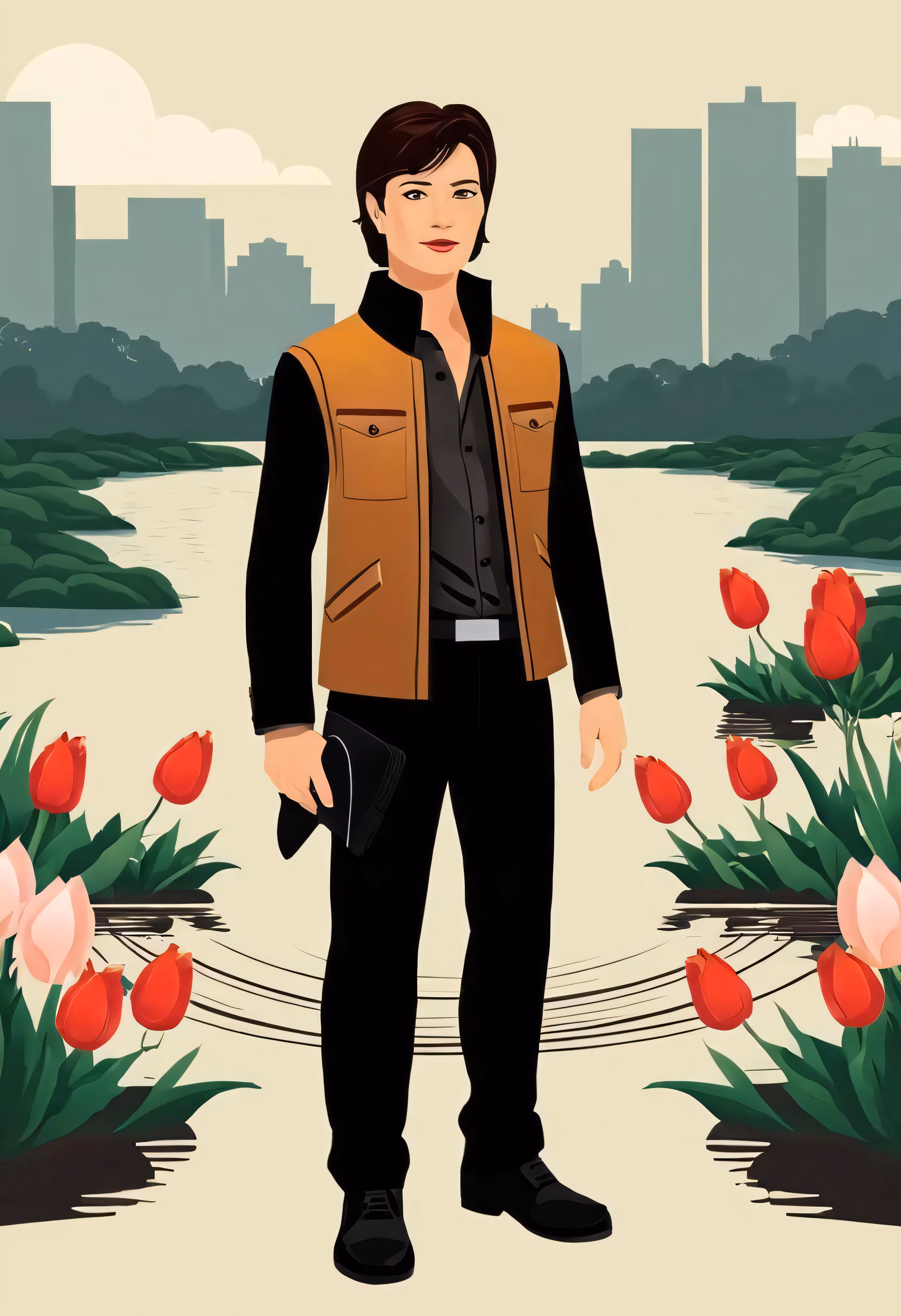 High resolution picture, free to use, an illustrated image of a man standing with flowers and greenery