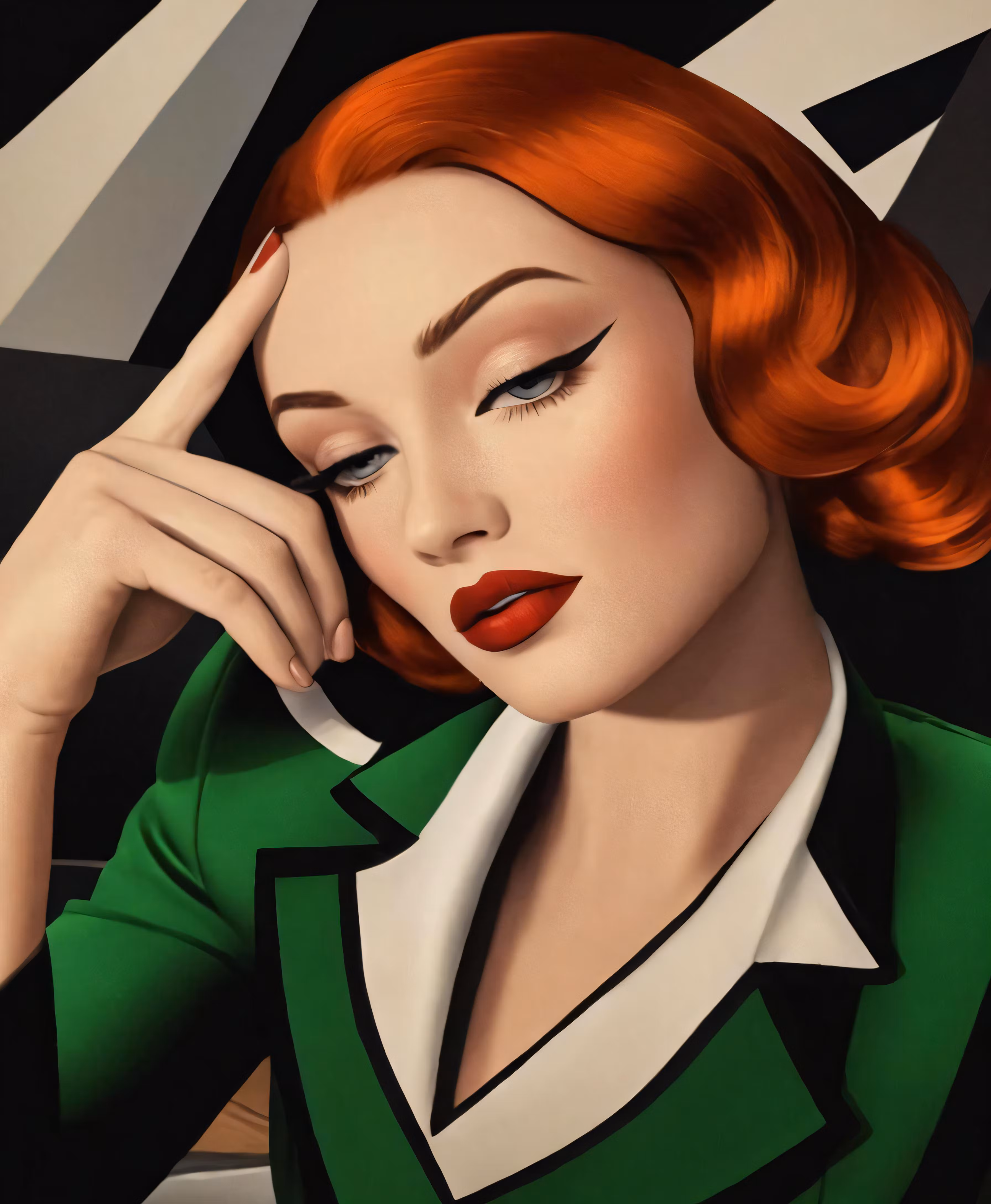 High resolution picture, free to use, an illustrated portrait of a woman with red hair wearing green and white
