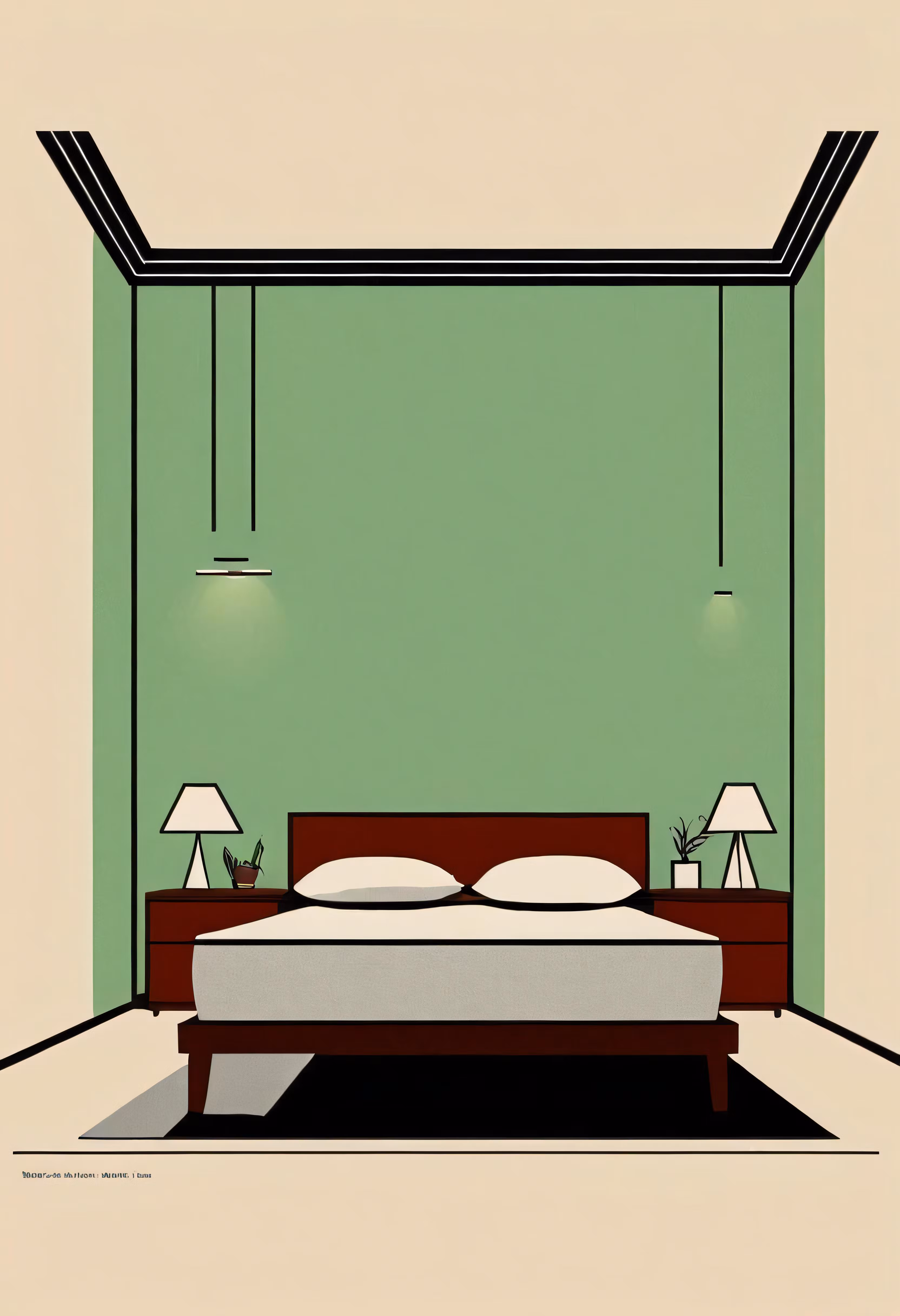 High resolution picture, free to use, an illustration of a bed room with a green wall