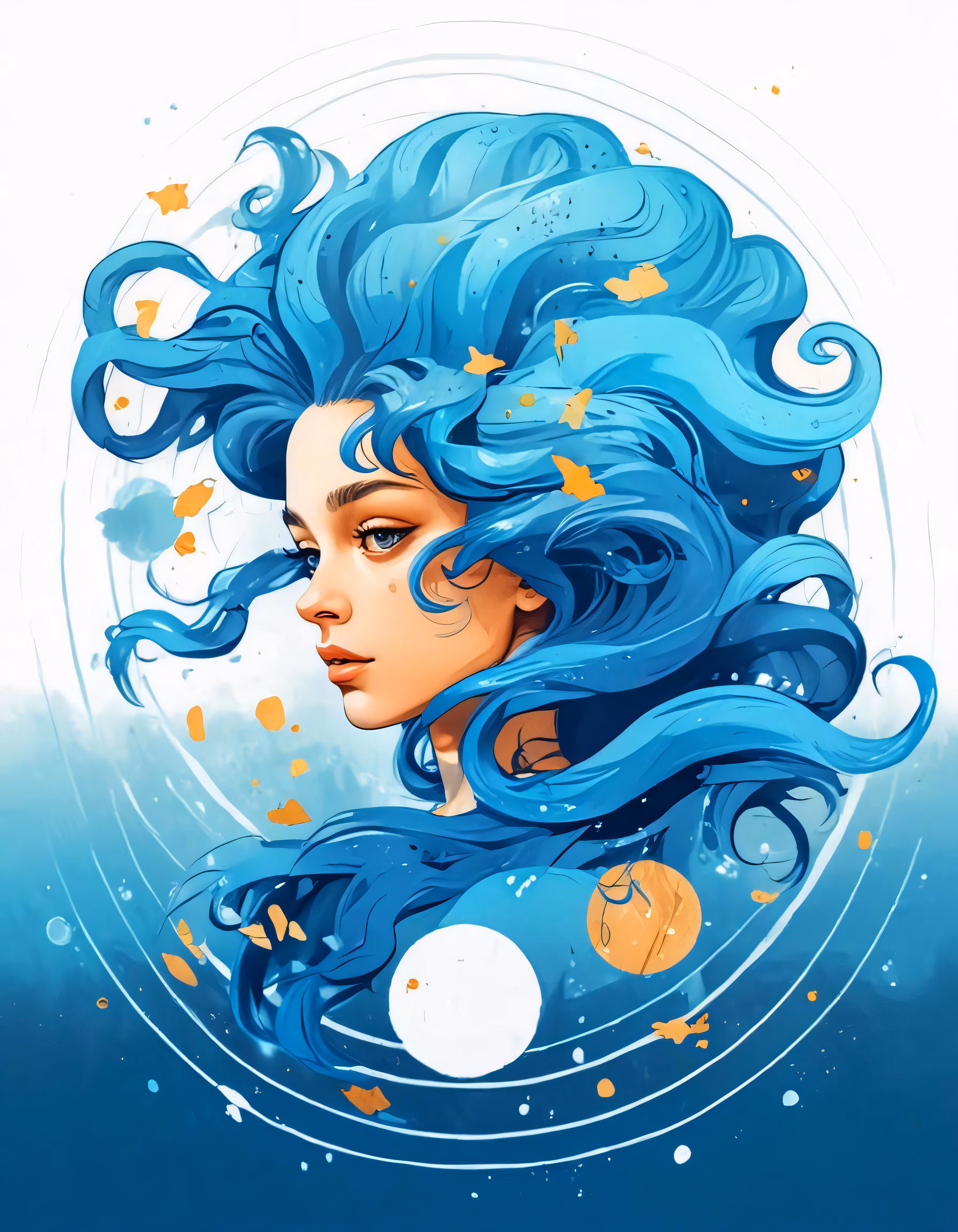 High resolution picture, free to use, an illustration of a blue haired girl with curly hair