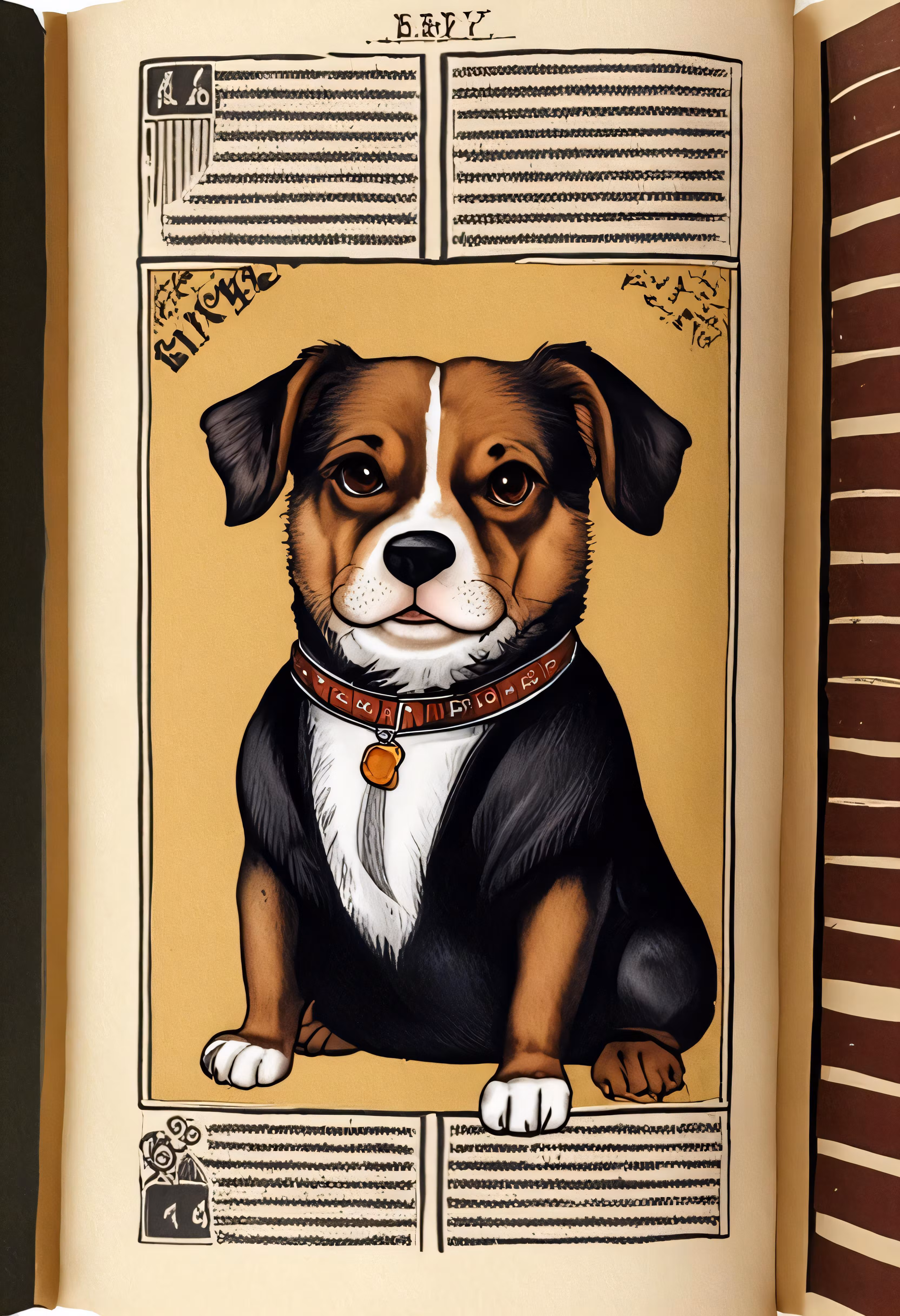 High resolution picture, free to use, an illustration of a brown and white dog sitting in the middle of an opened book