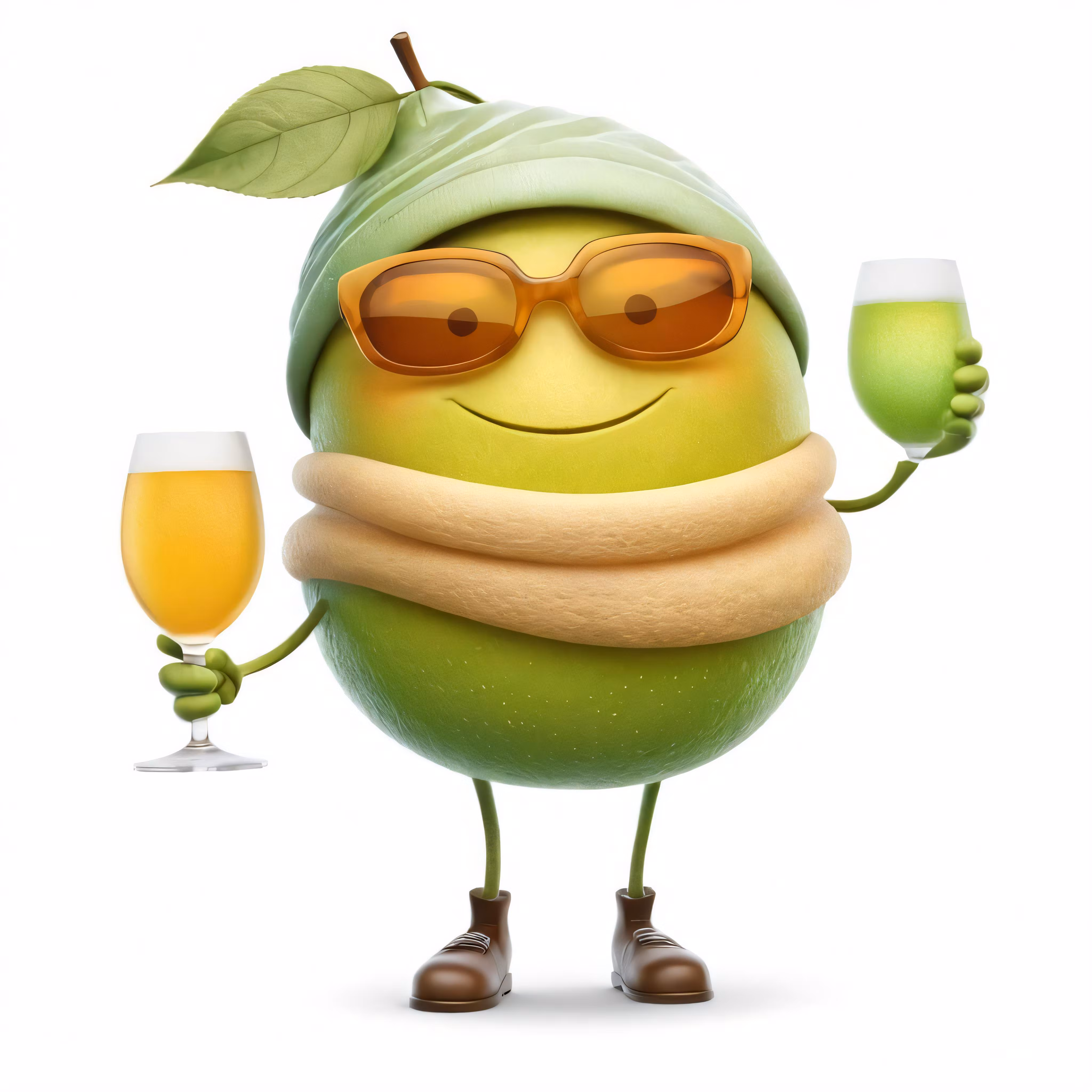 High resolution picture, free to use, an illustration of a cartoon character with sunglasses and a scarf holding a glass of beer