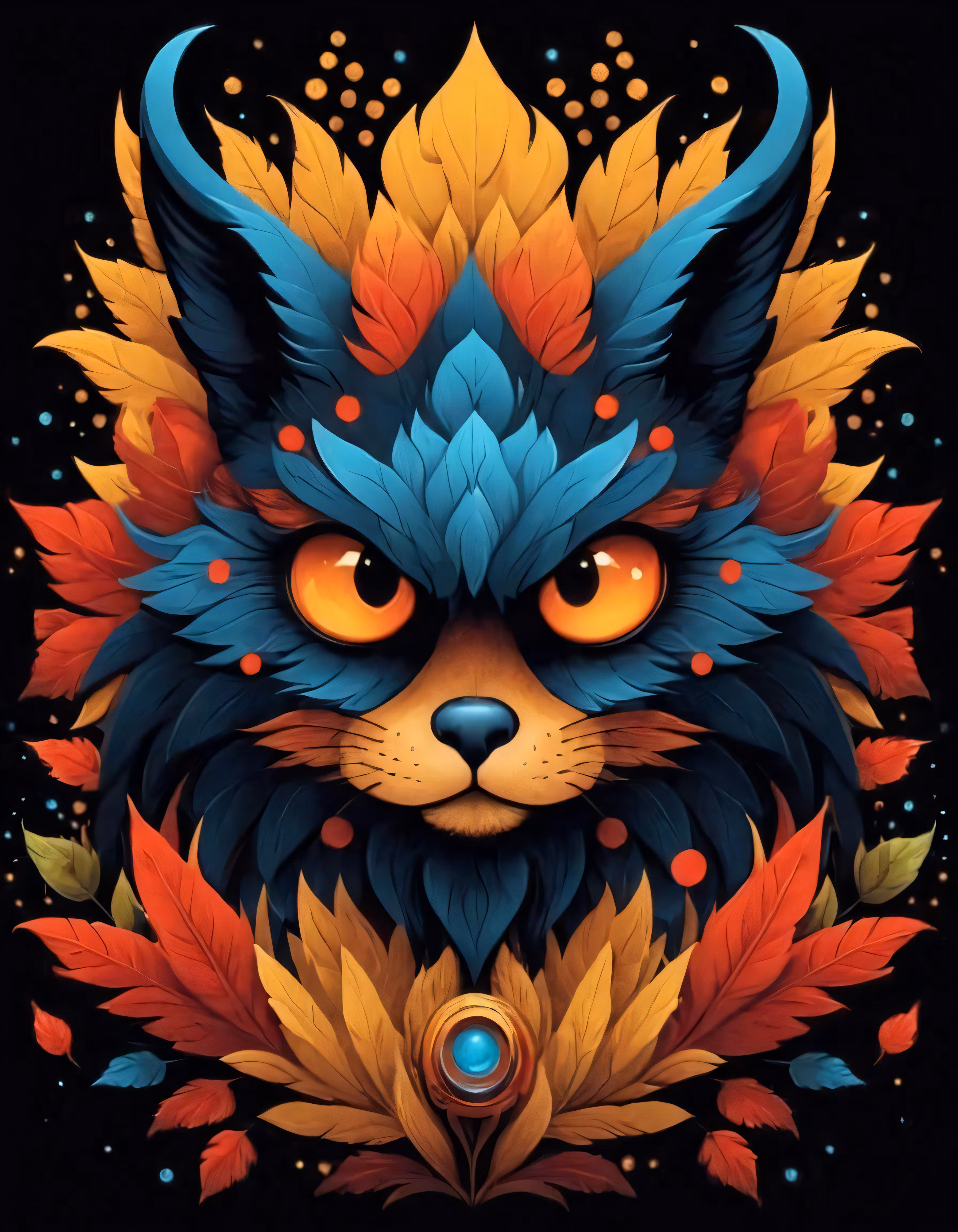 High resolution picture, free to use, an illustration of a fox with colorful leaves and flowers on its head