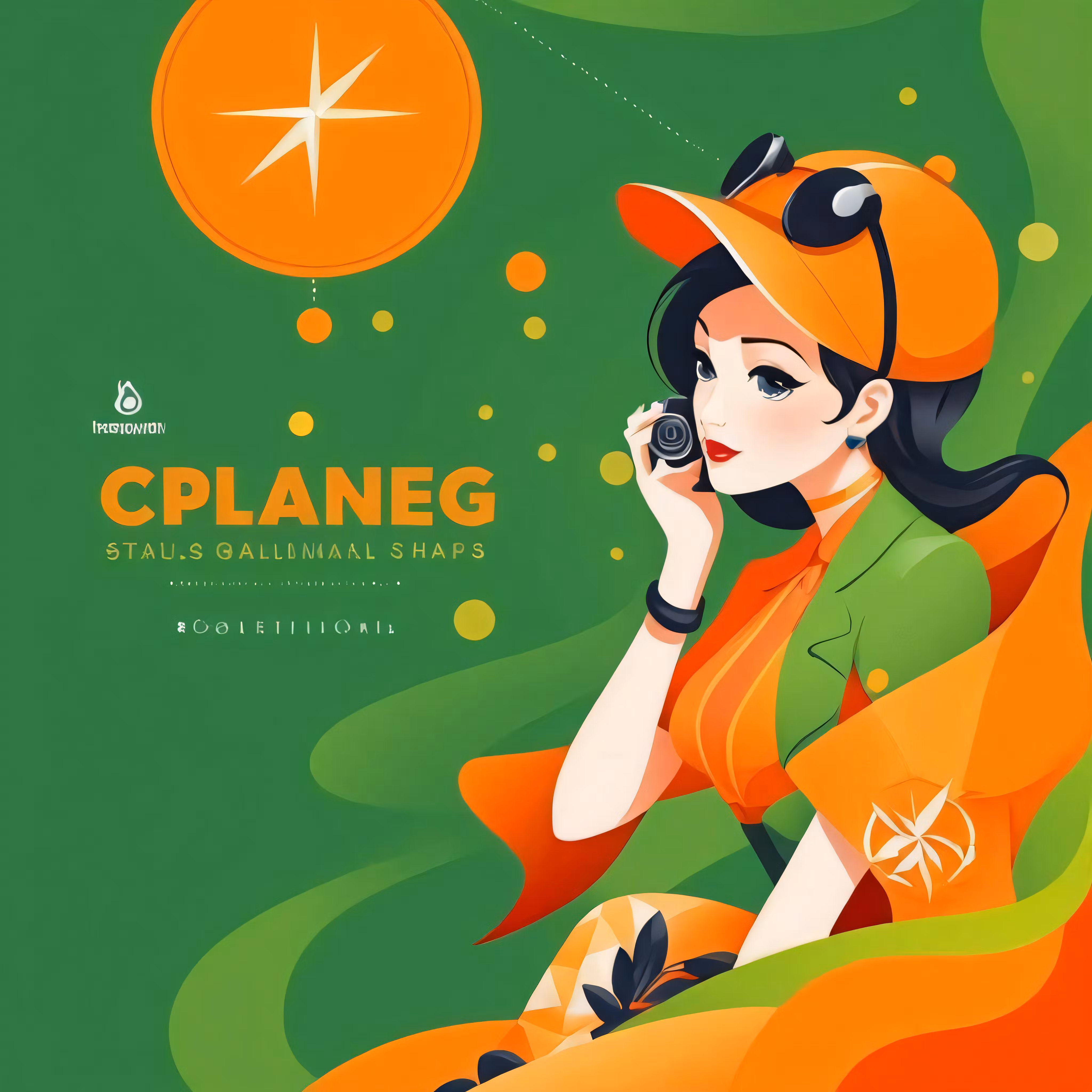 High resolution picture, free to use, an illustration of a girl with oranges talking on a cell phone