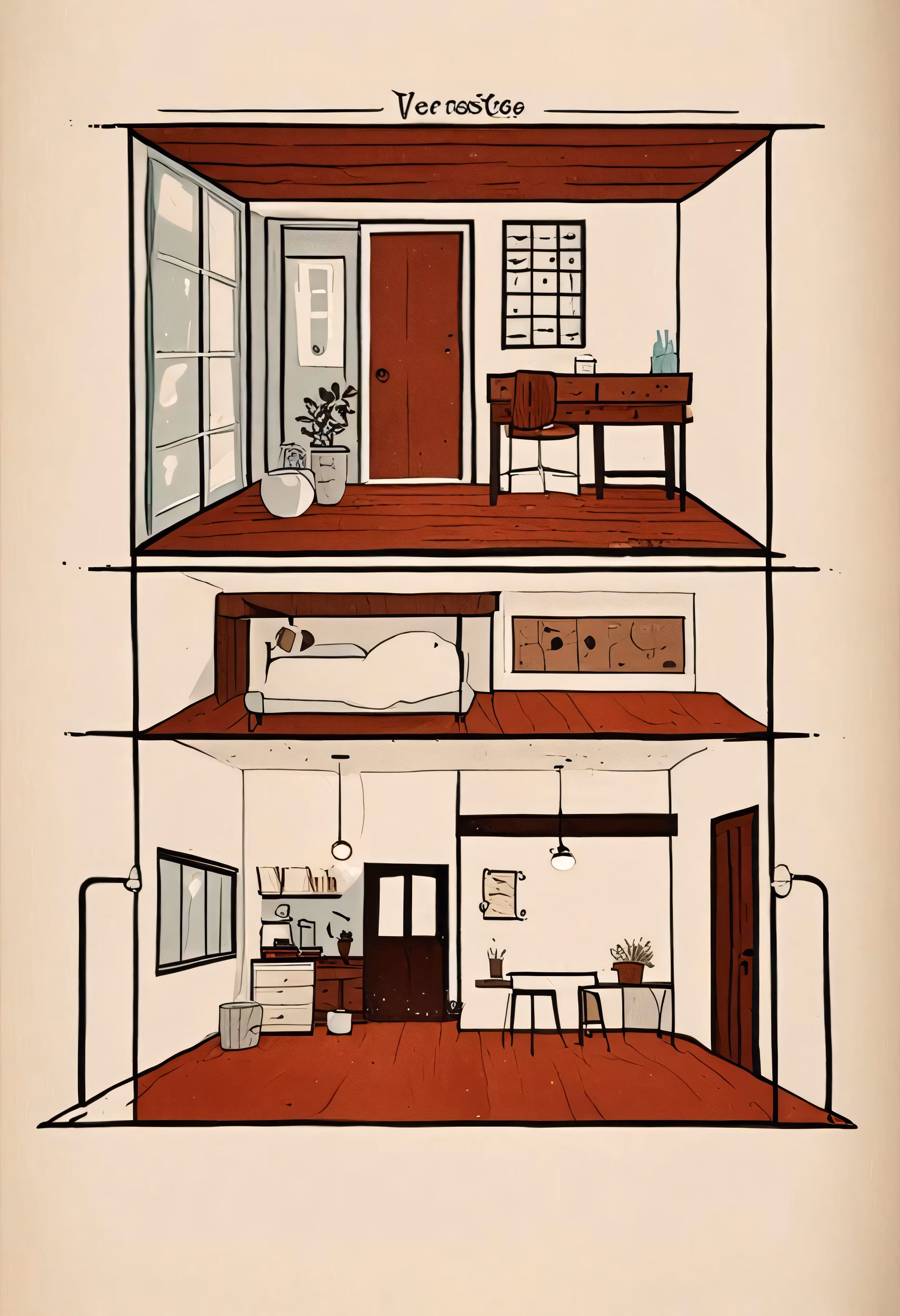 High resolution picture, free to use, an illustration of a house with furniture in four different sections