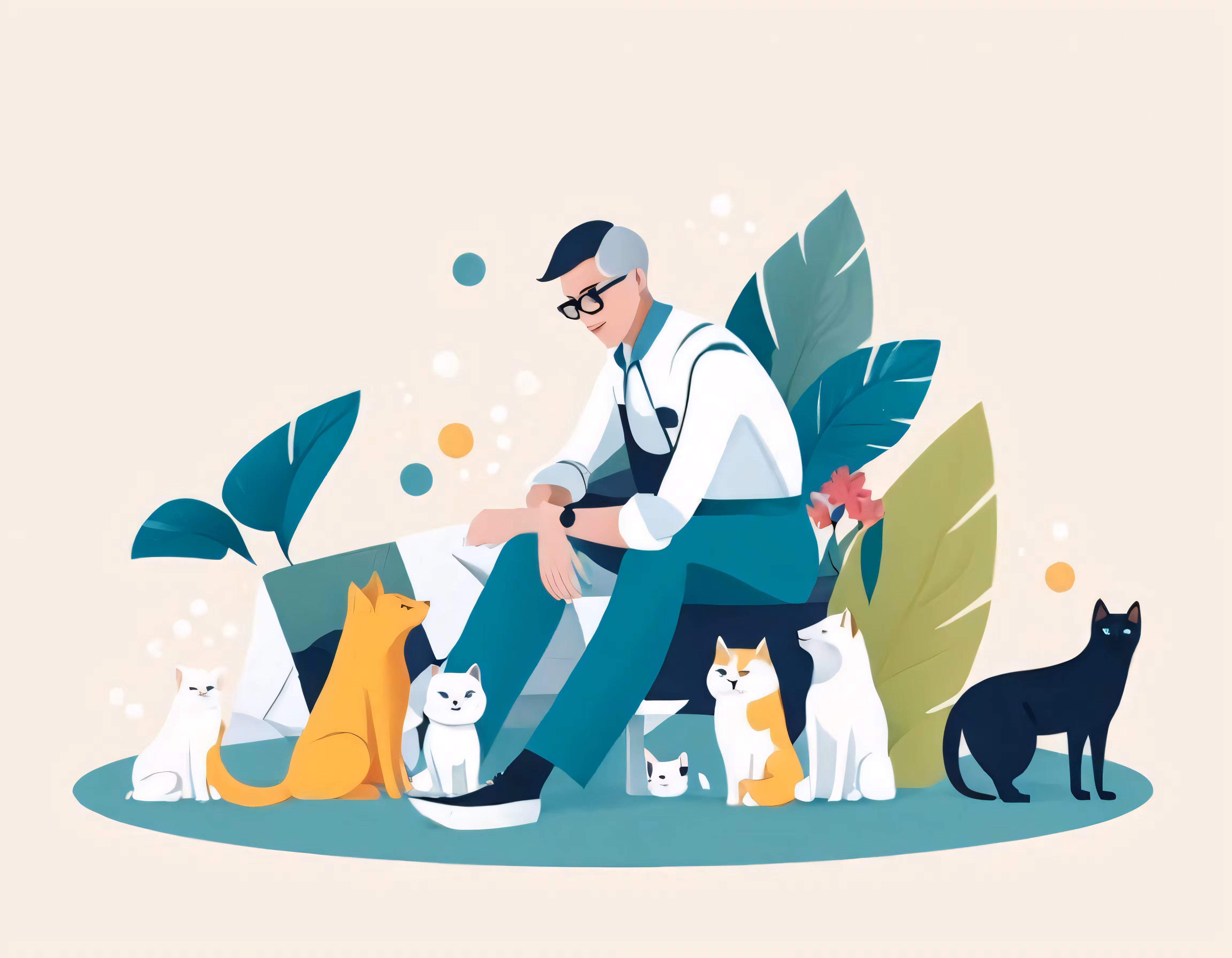 High resolution picture, free to use, an illustration of a man sitting in front of several cats