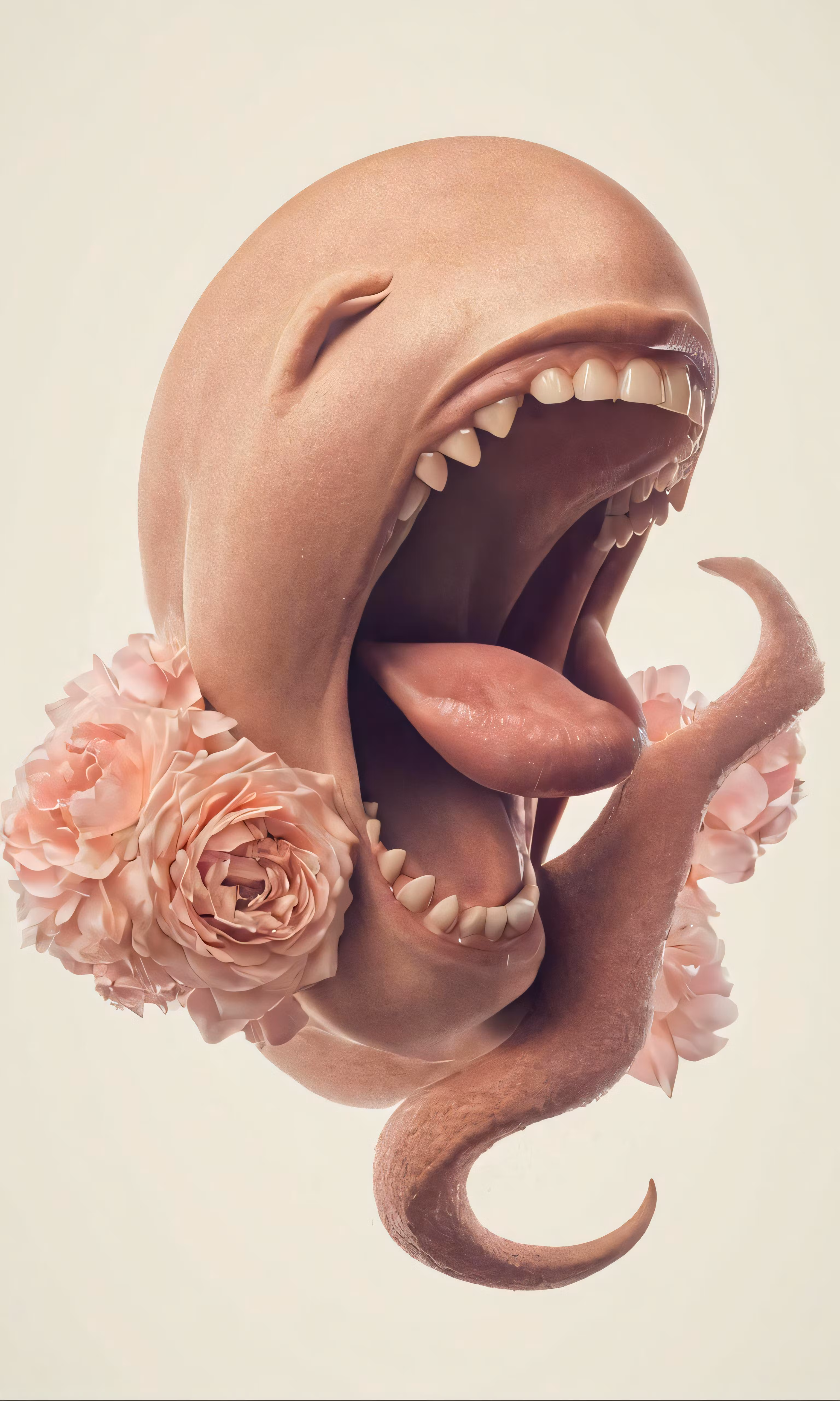 High resolution picture, free to use, an illustration of a mouth and flowers with the head sticking out