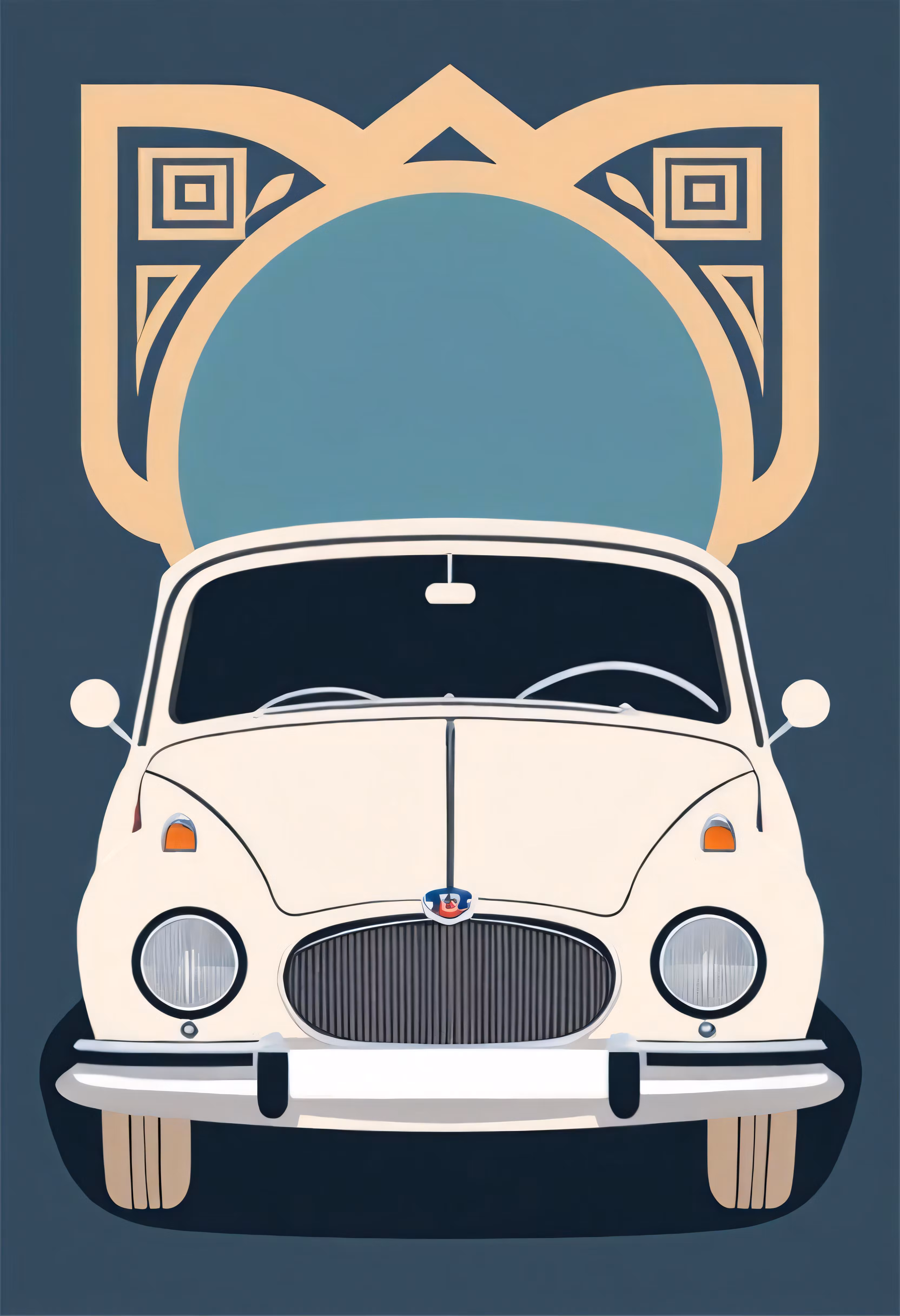 High resolution picture, free to use, an illustration of a white car with a decorative arch on the roof