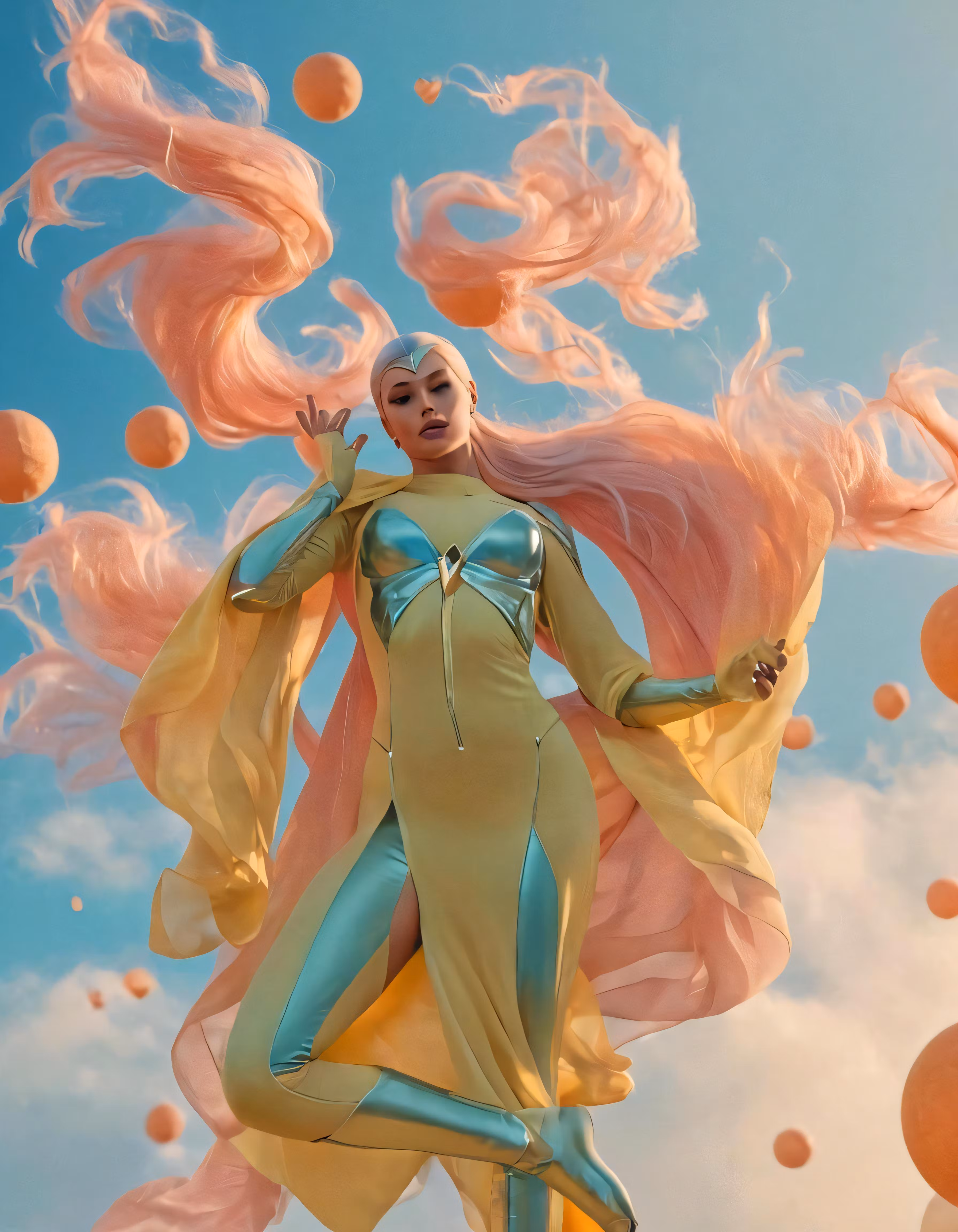 High resolution picture, free to use, an illustration of a woman in a yellow and blue outfit with pink and yellow fabric blowing around her