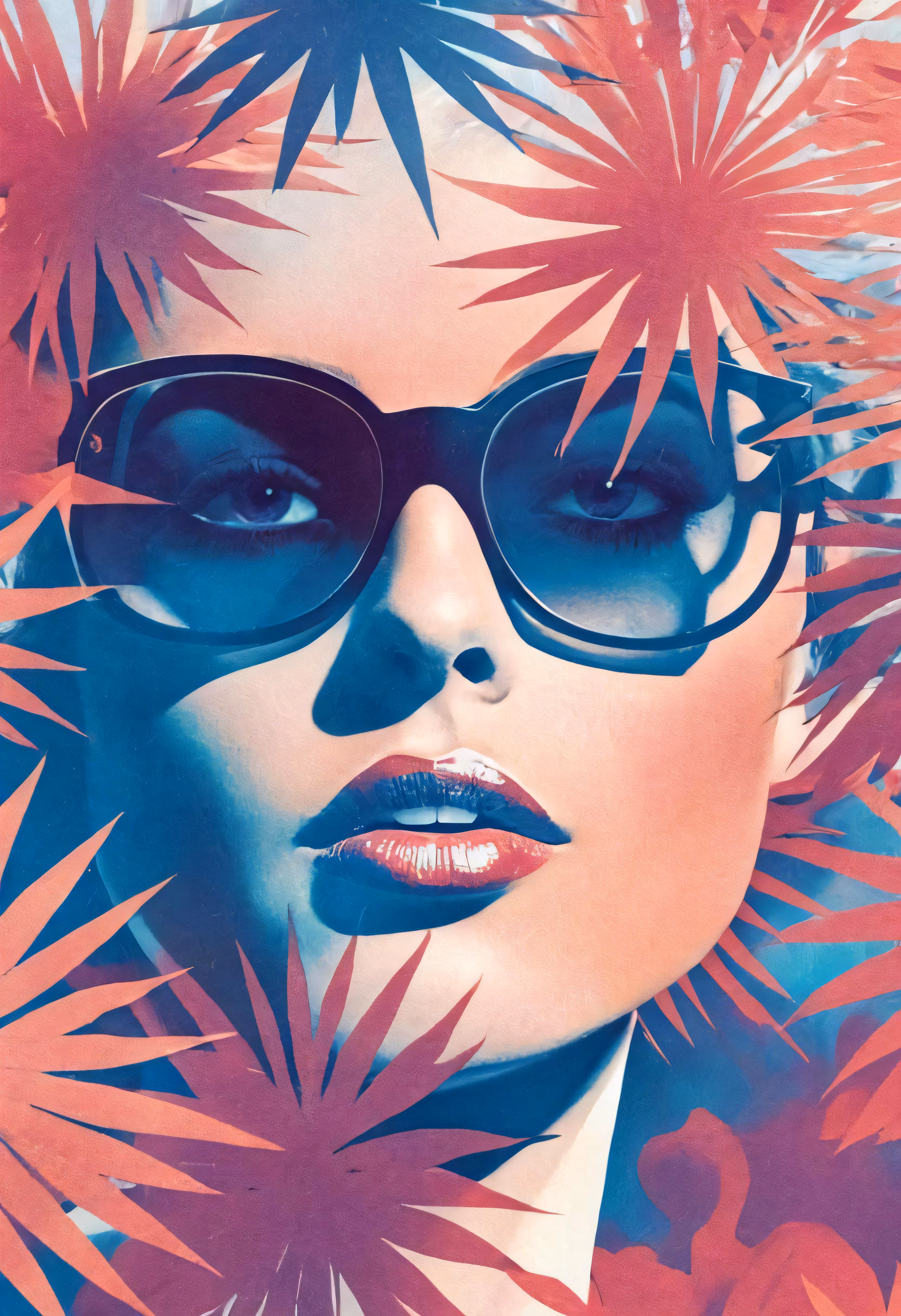 High resolution picture, free to use, an illustration of a woman in black sunglasses with flowers behind her
