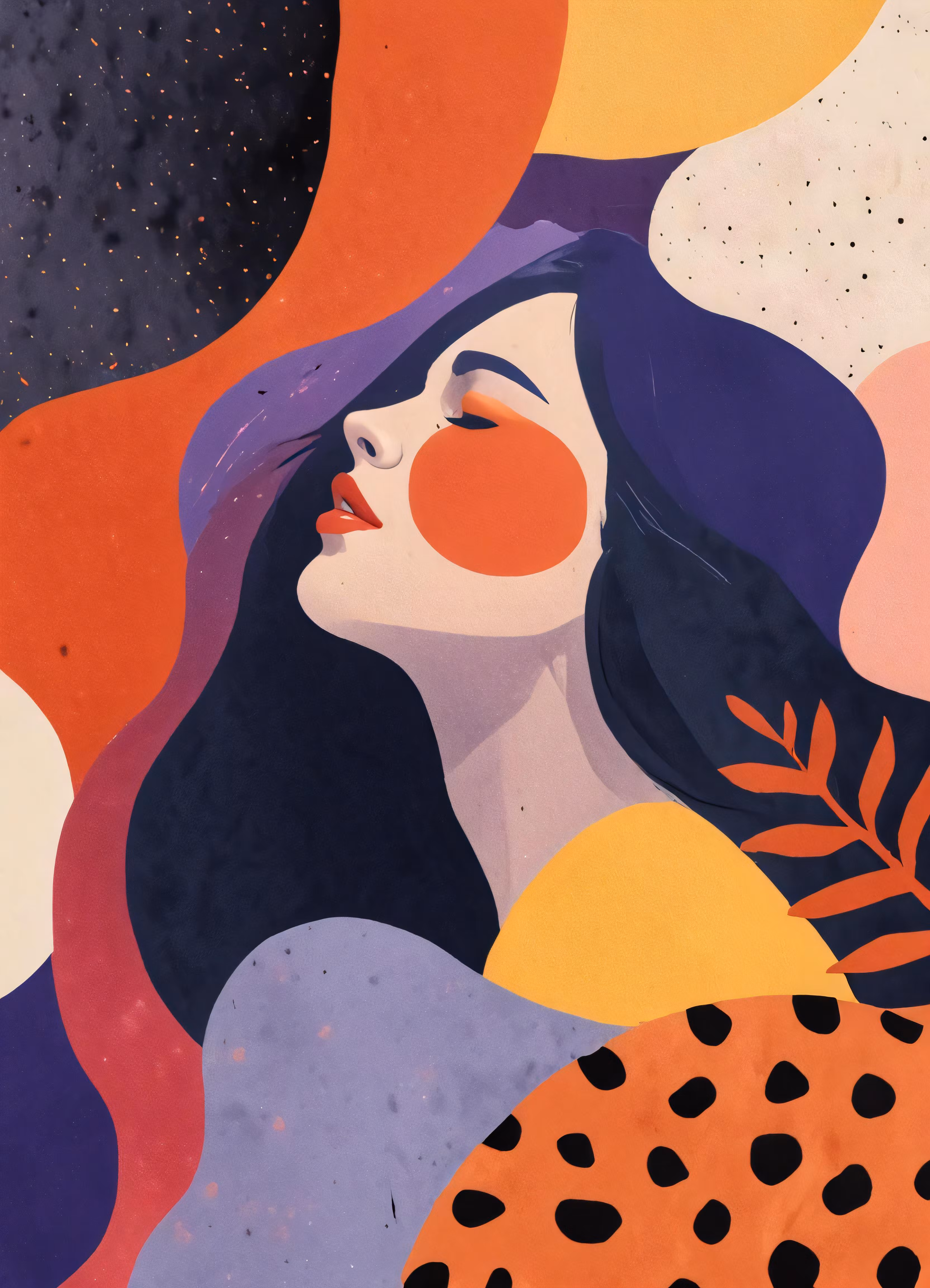 High resolution picture, free to use, an illustration of a woman with red nose and long hair with black dots around her