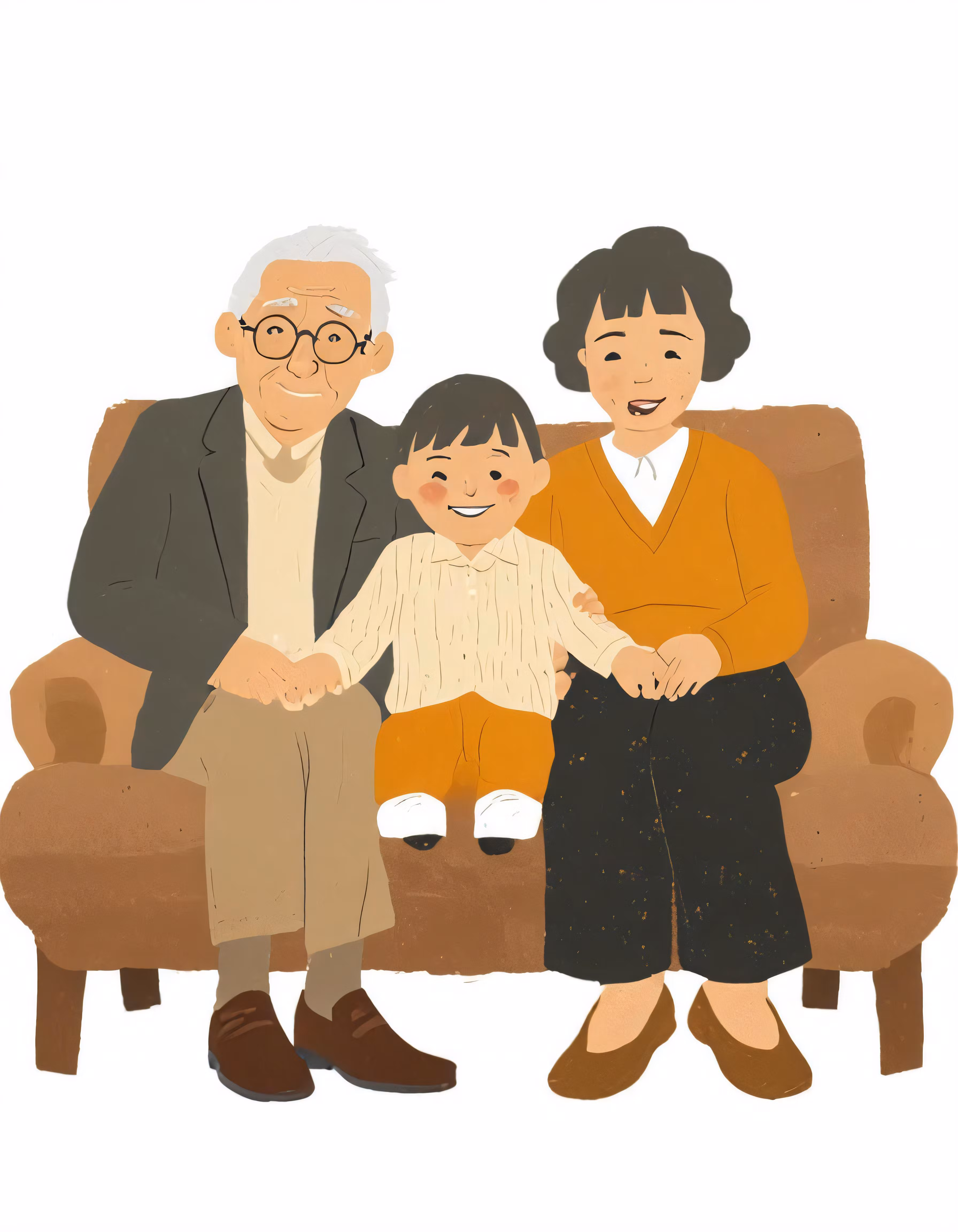 High resolution picture, free to use, an illustration of an old man, woman, and child on a couch