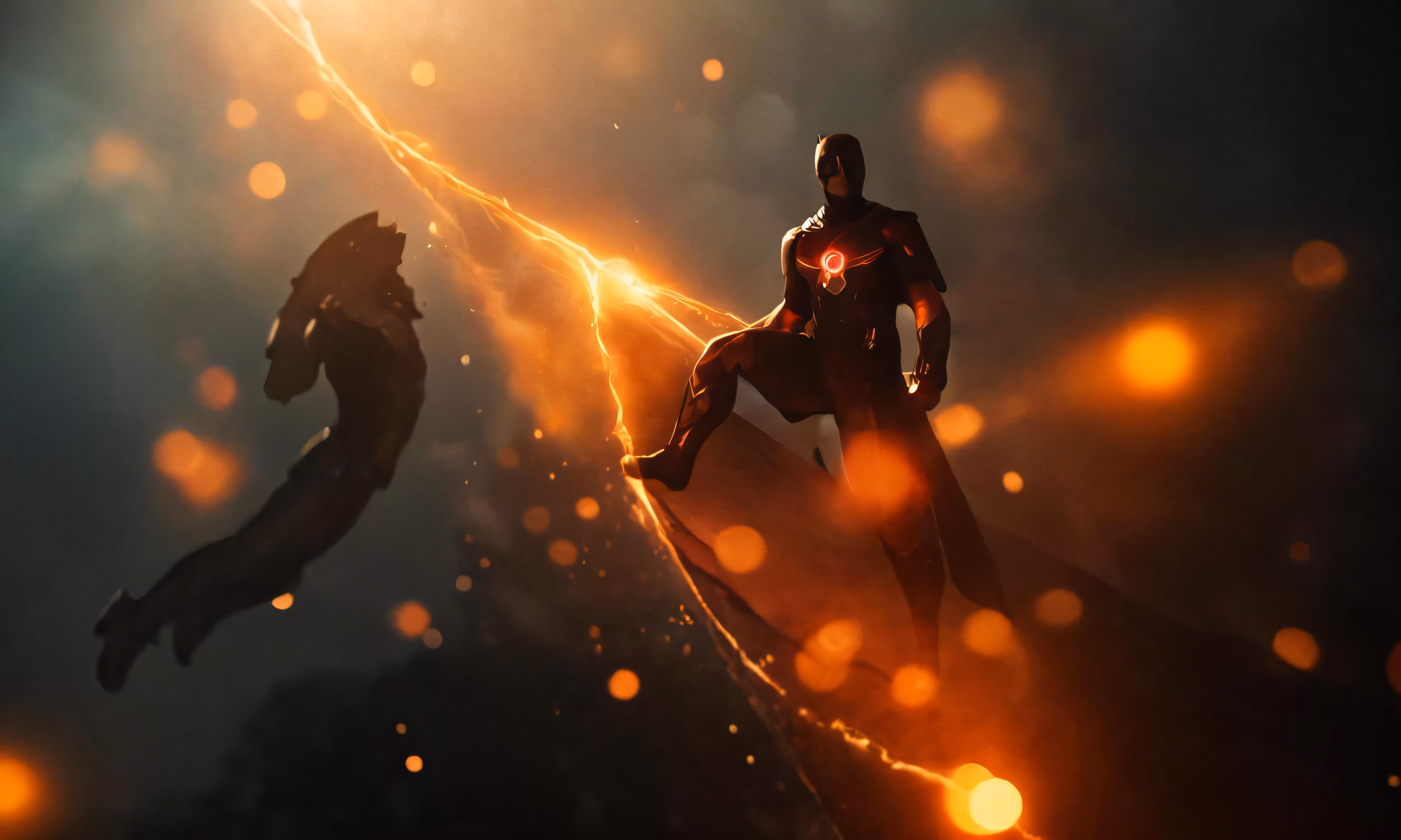 High resolution picture, free to use, an illustration showing the powerman on top of a rock, with energy spinning around him