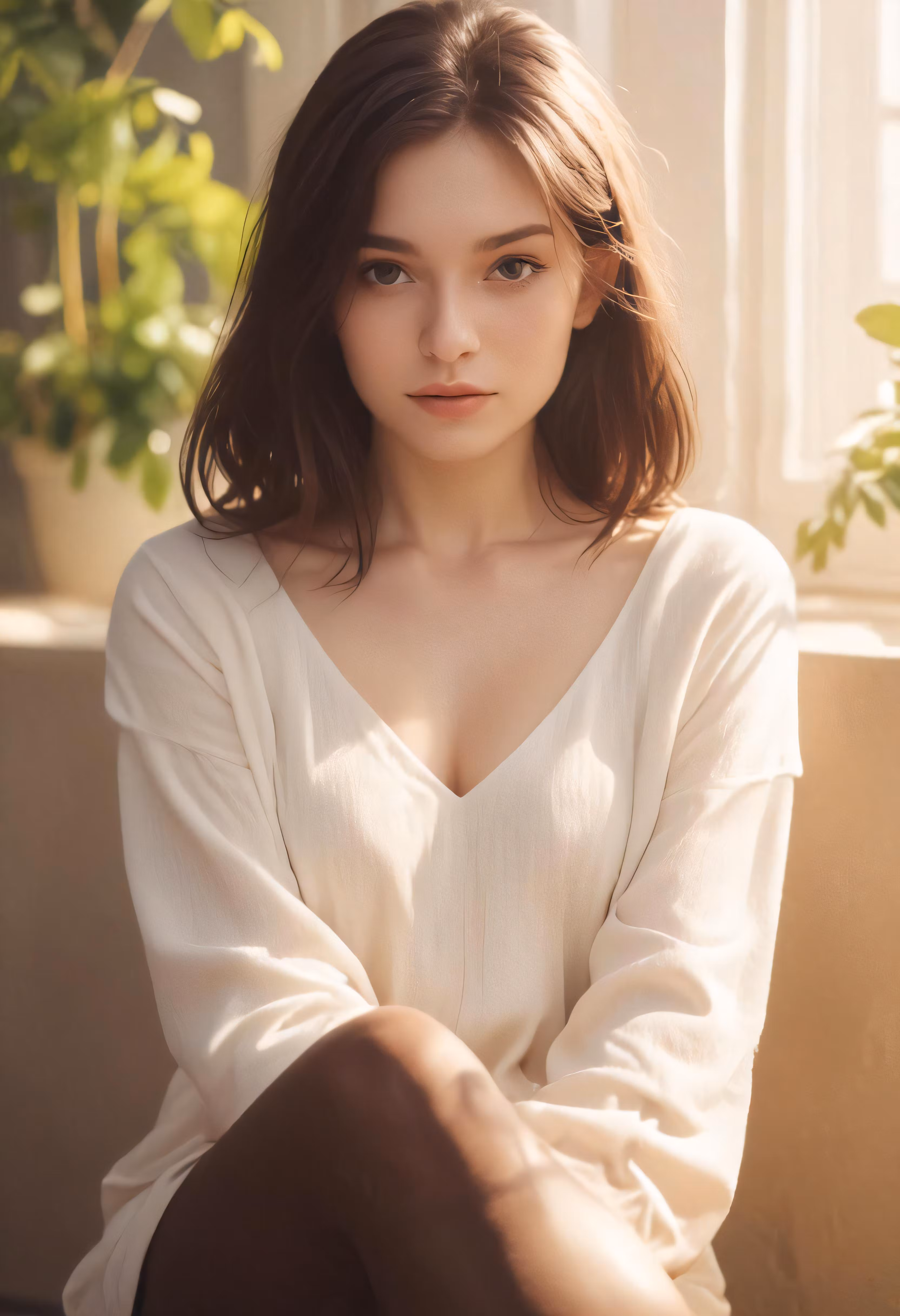 High resolution picture, free to use, an image of a beautiful young woman with large breast sitting on a window sill