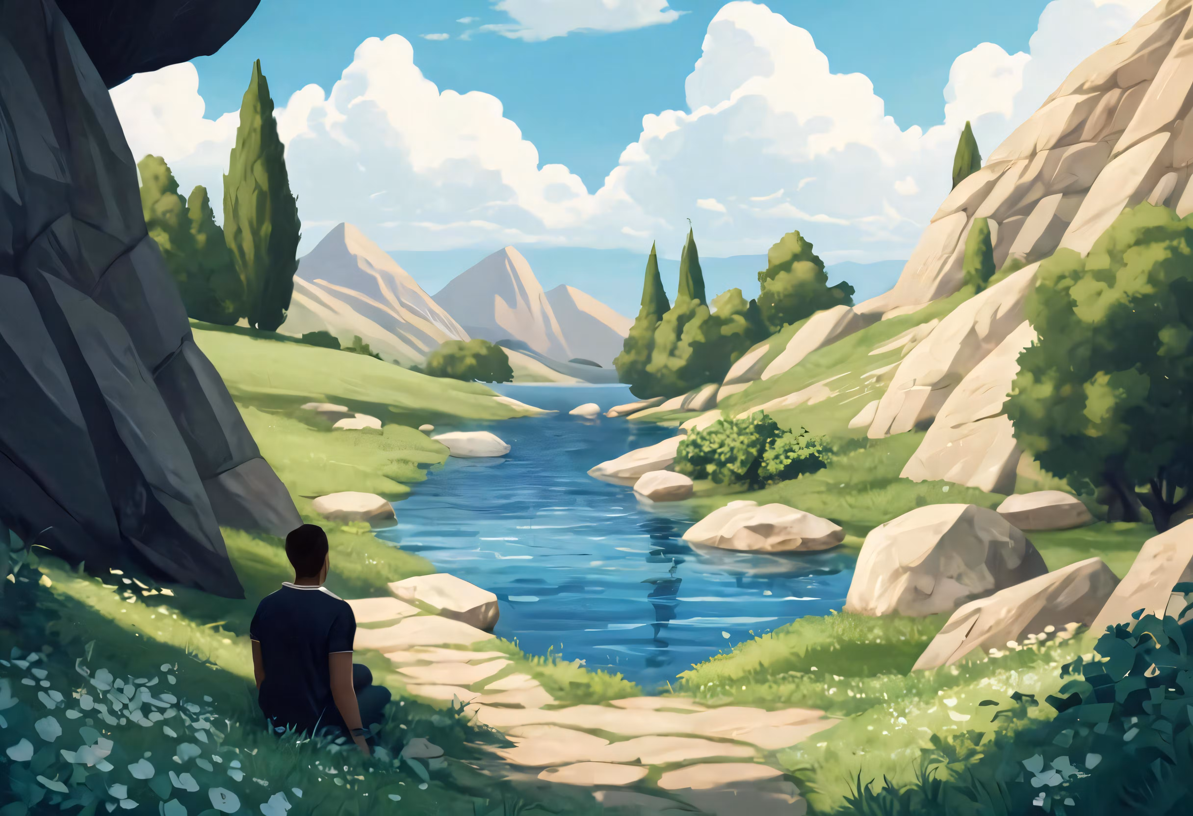 High resolution picture, free to use, an image of a cartoon painting of a man sitting on a cliff