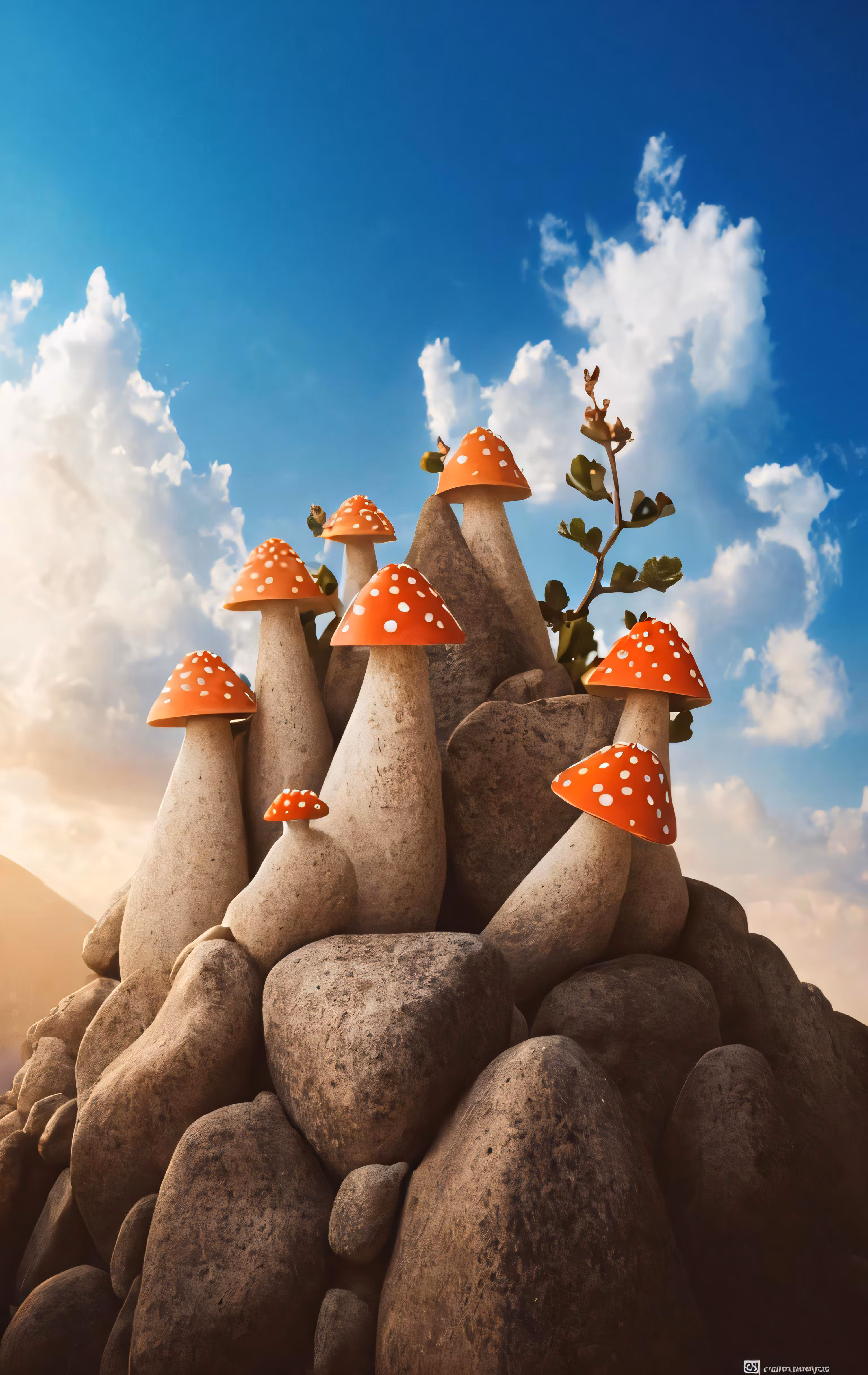 High resolution picture, free to use, an image of a mushroom rock with small mushrooms on it