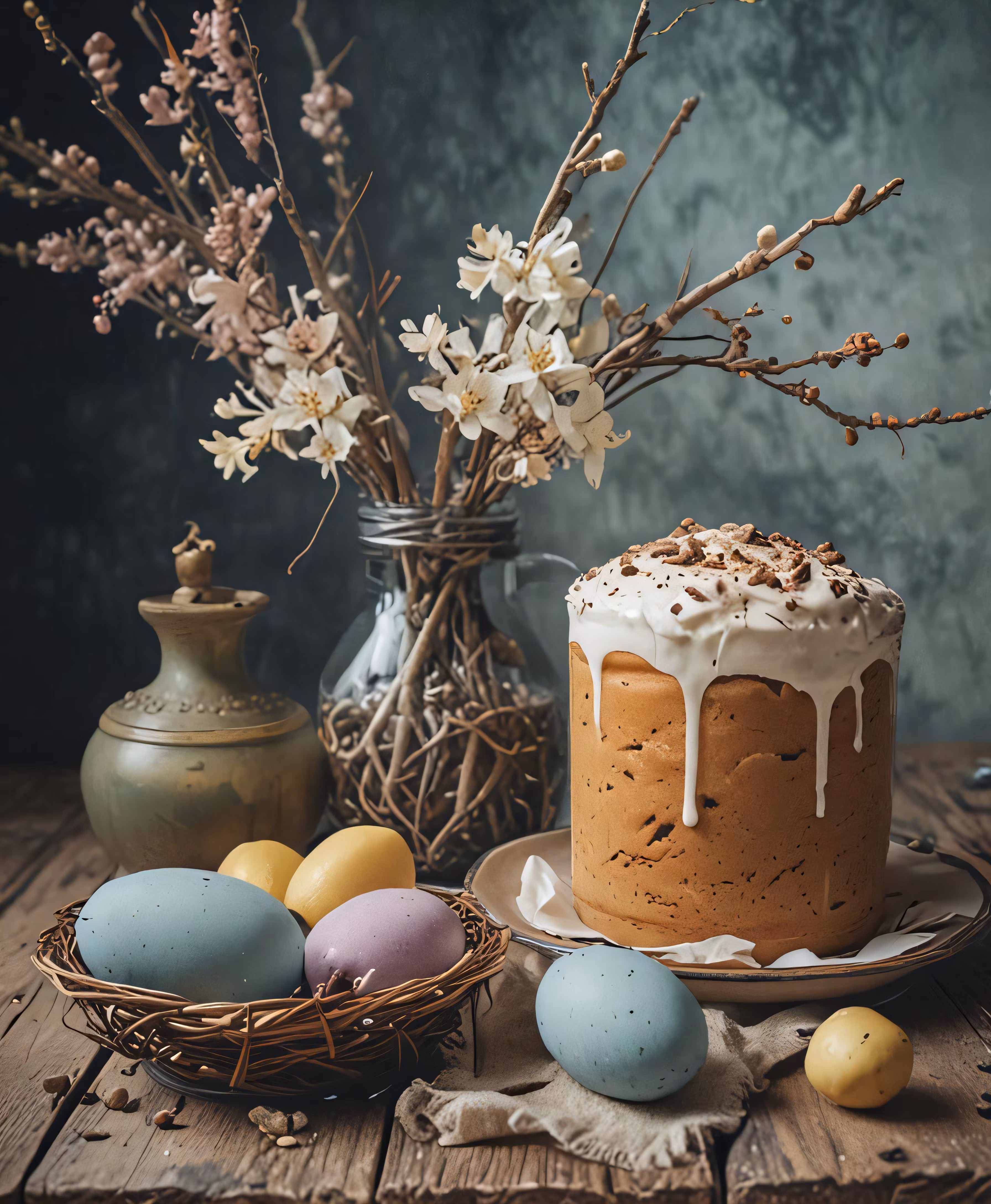 High resolution picture, free to use, an image of a table with flowers, eggs and a cake
