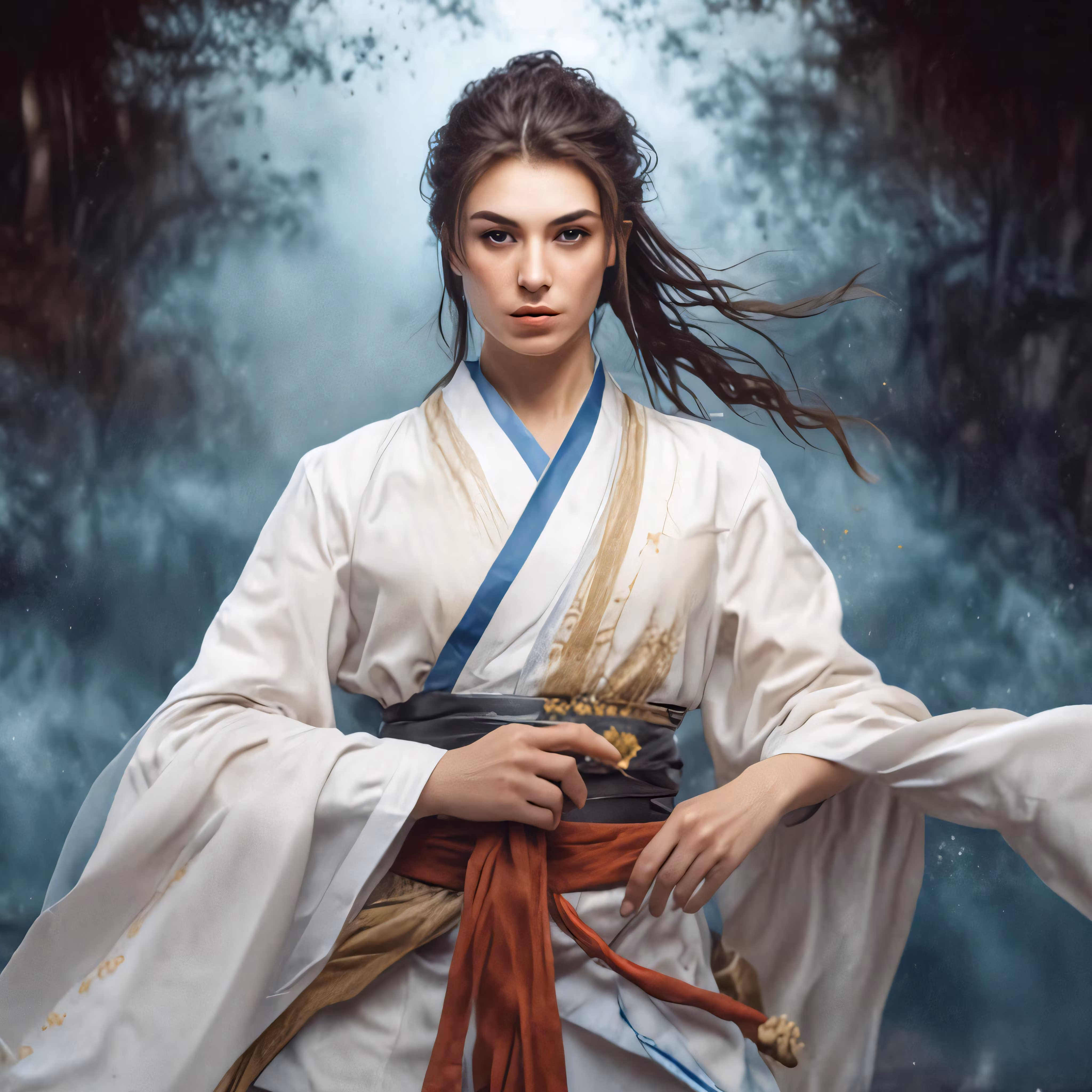 High resolution picture, free to use, an image of a woman in oriental dress holding a sword