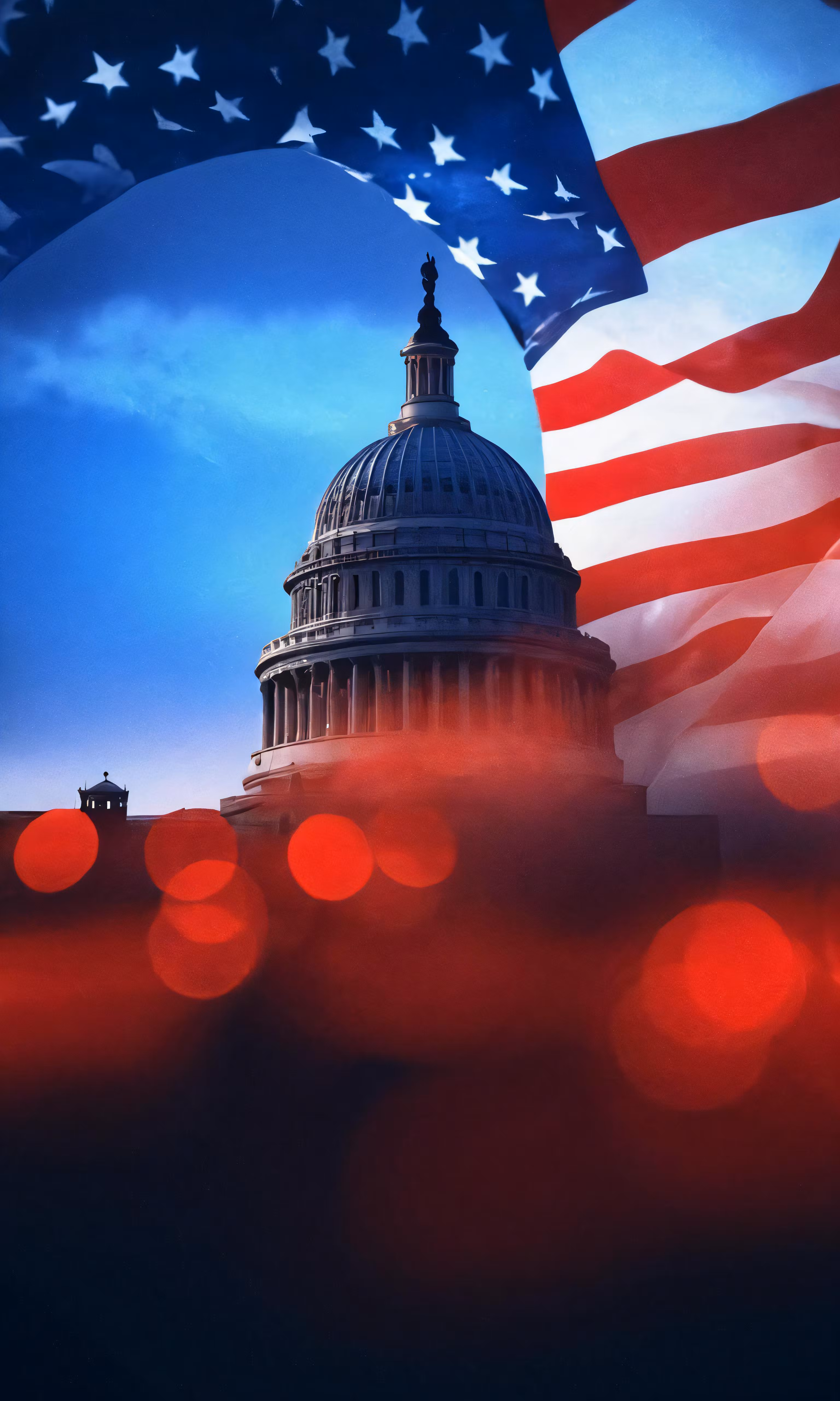 High resolution picture, free to use, an image of an american flag flying in front of the dome of the us capitol