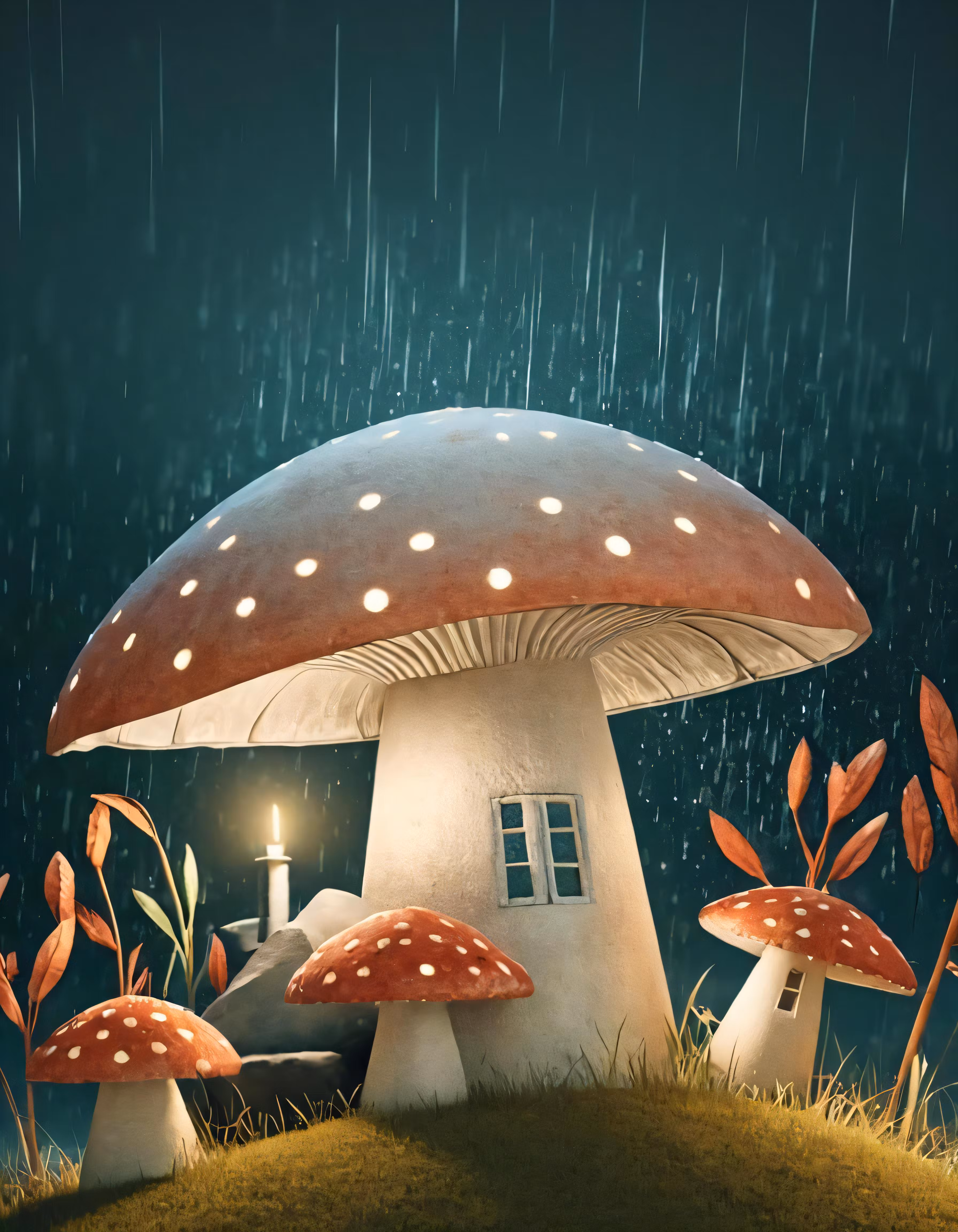 High resolution picture, free to use, an image of mushroom house with a candle inside