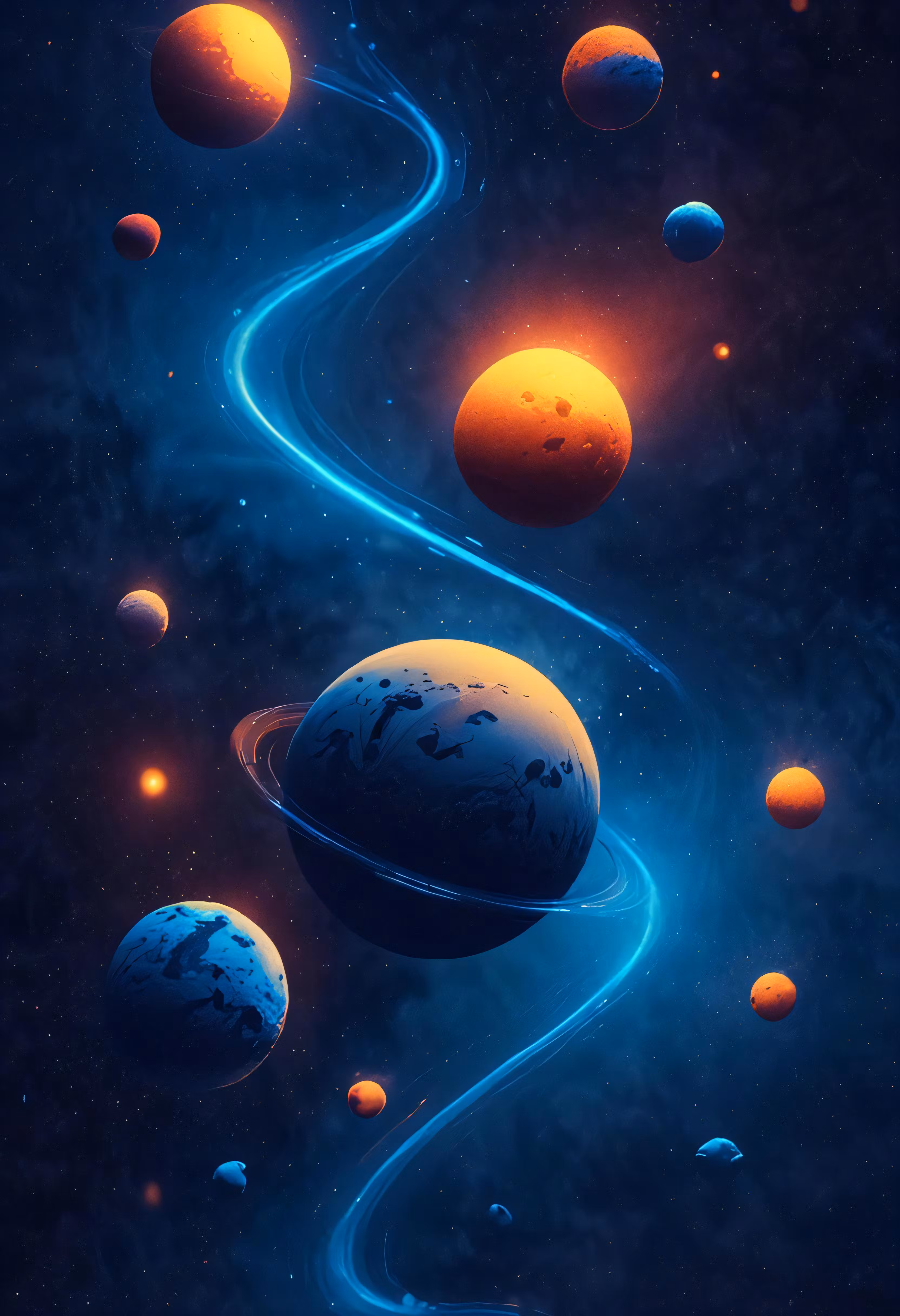 High resolution picture, free to use, an image of planets, with their closest stars and spirally lines
