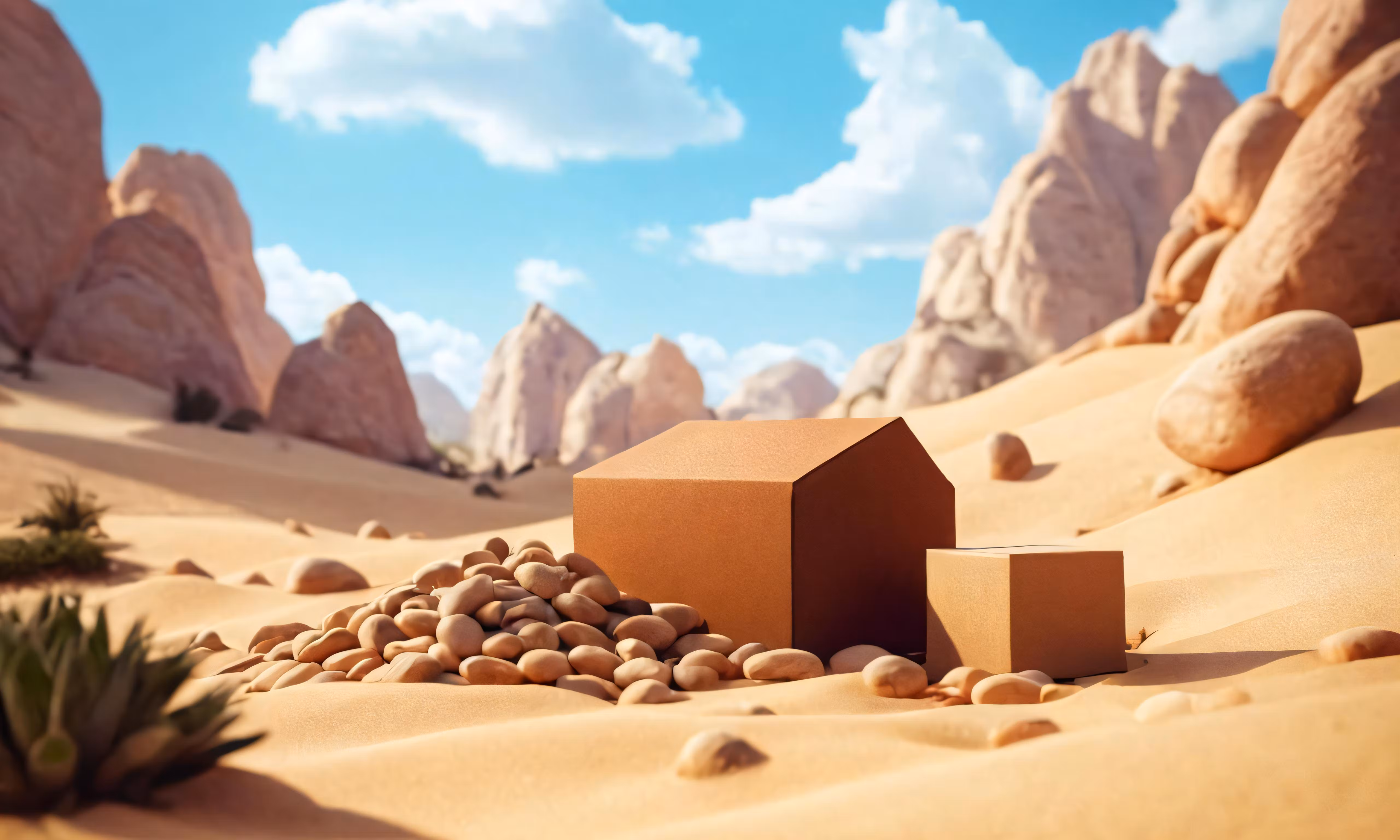 High resolution picture, free to use, an image of rocks and a building that is in the sand