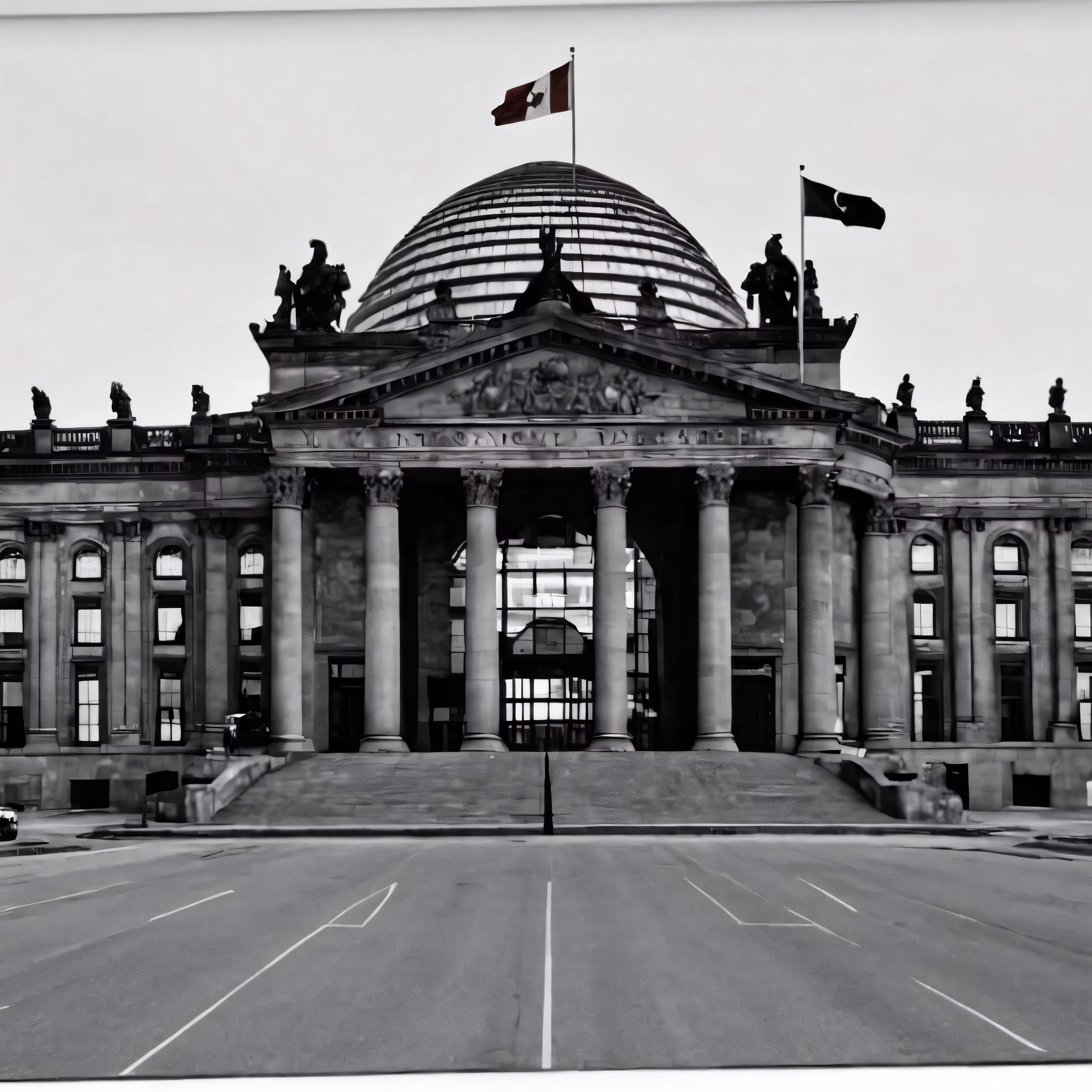 High resolution picture, free to use, an image of the front of a building that has columns and a flag on top
