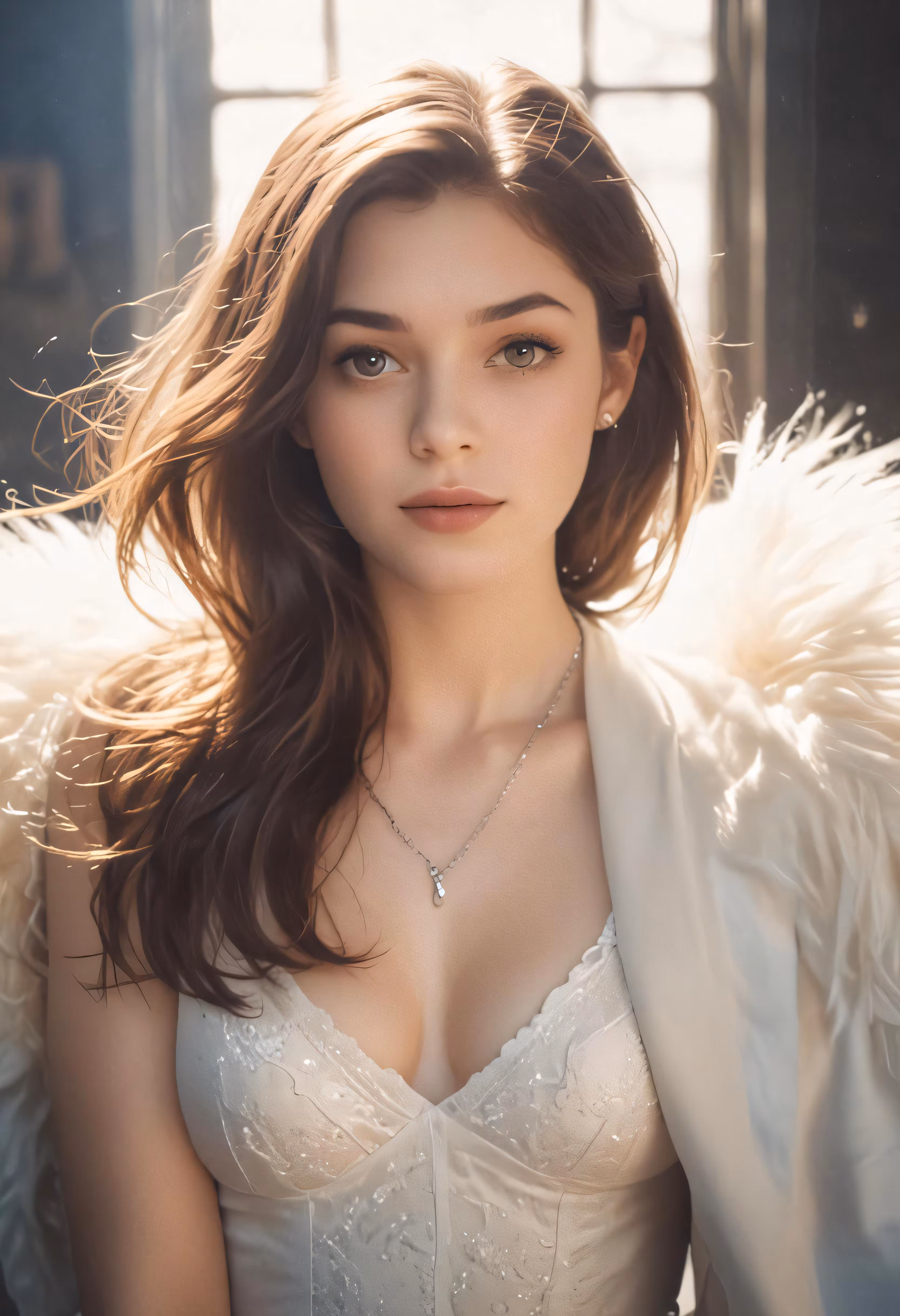 High resolution picture, free to use, an image of woman in white dress with fur on shoulders
