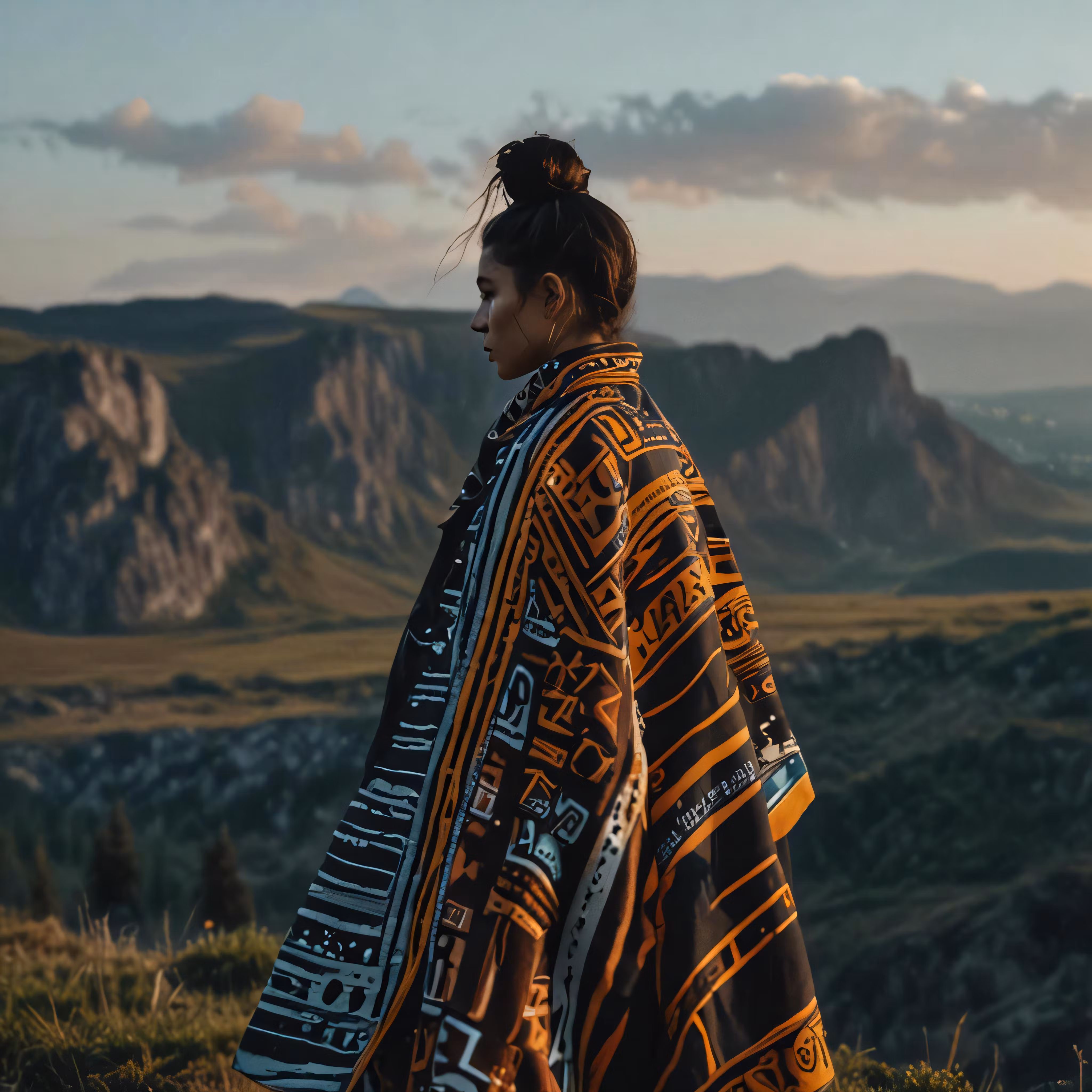 High resolution picture, free to use, an individual dressed in native clothing stands on a mountain ridge