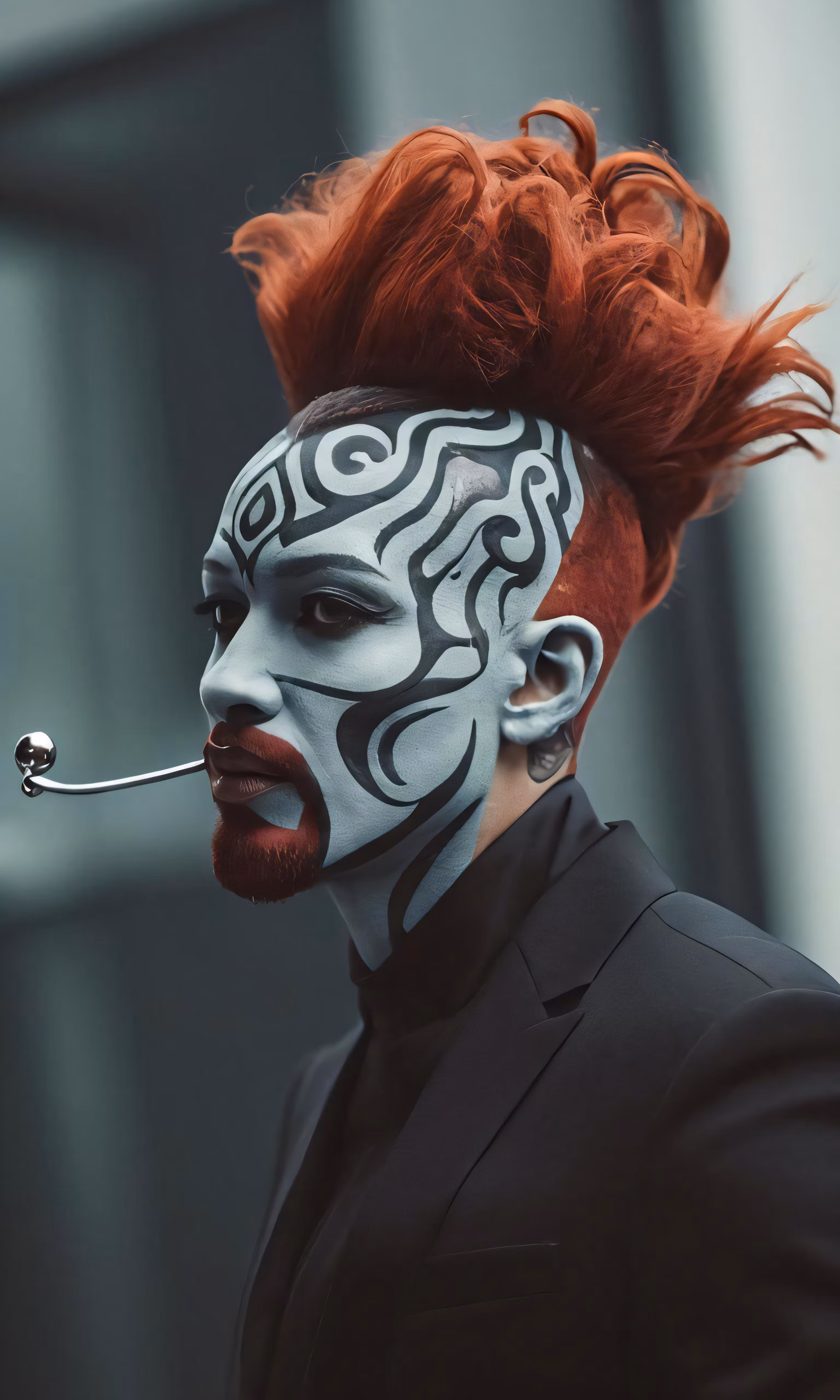 High resolution picture, free to use, an individual with the face painted as a dragon with hair on top