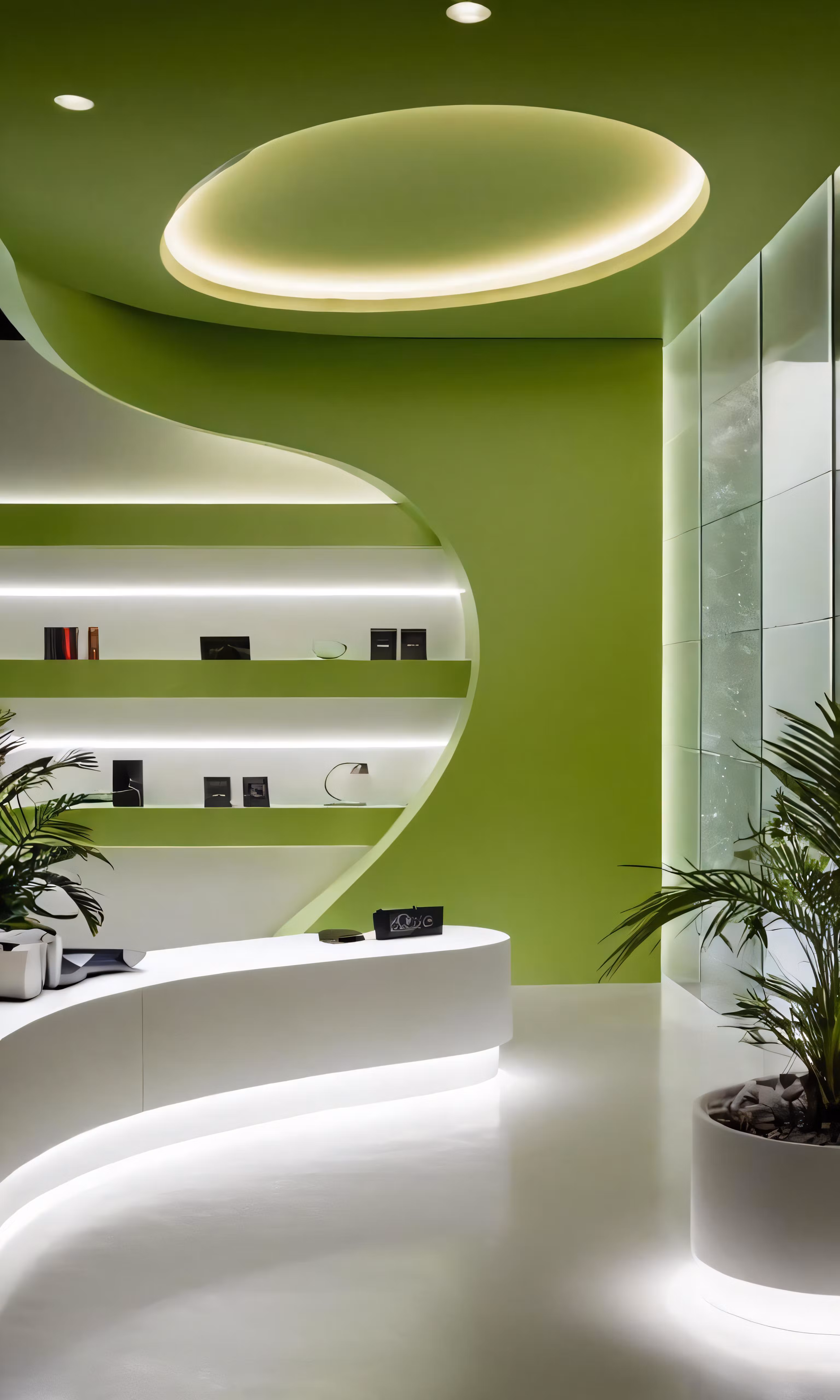 High resolution picture, free to use, an indoor area with a bright green wall and lighting