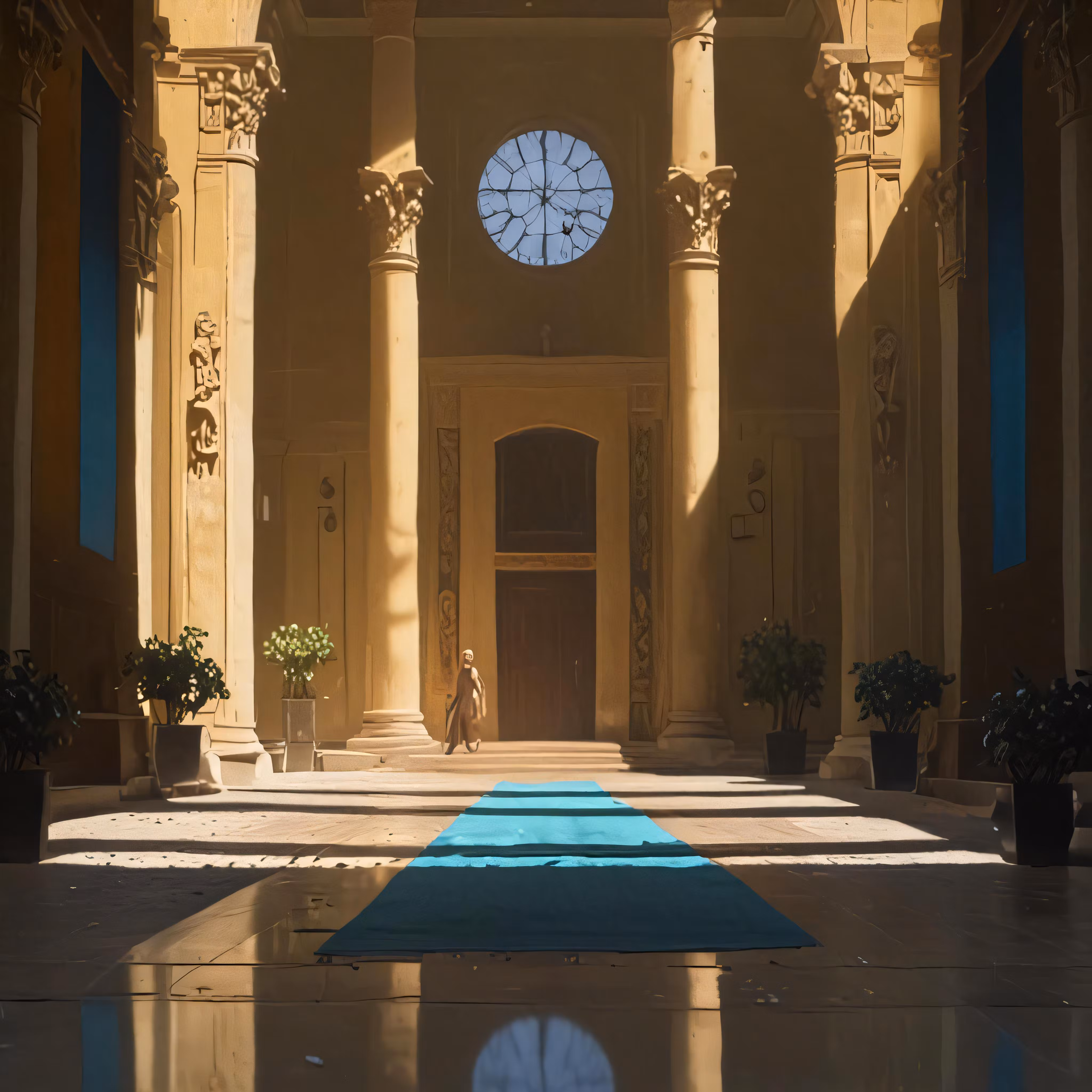 High resolution picture, free to use, an indoor courtyard with tall columns and blue rug