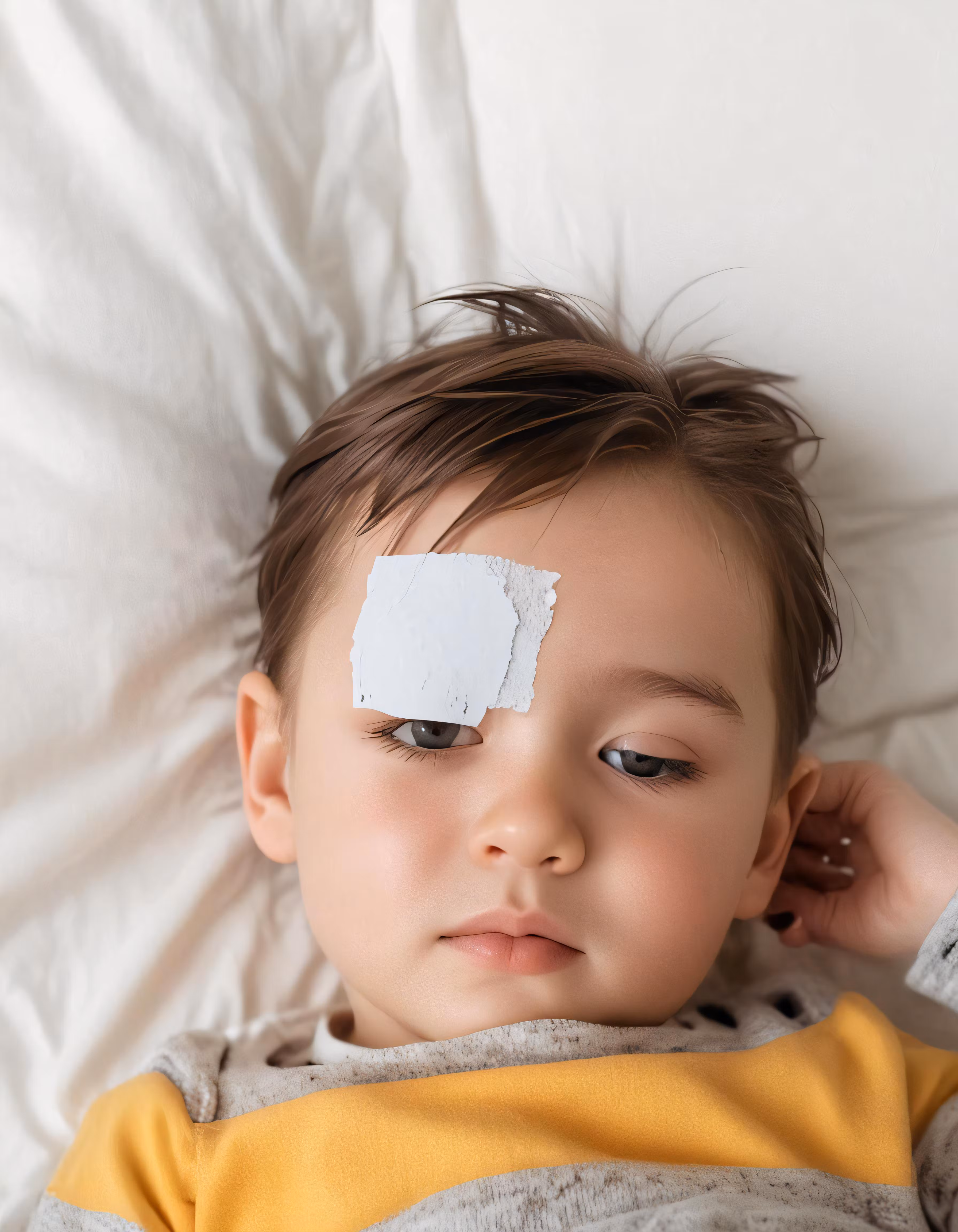 High resolution picture, free to use, an infant lying in bed with two pieces of paper on their forehead