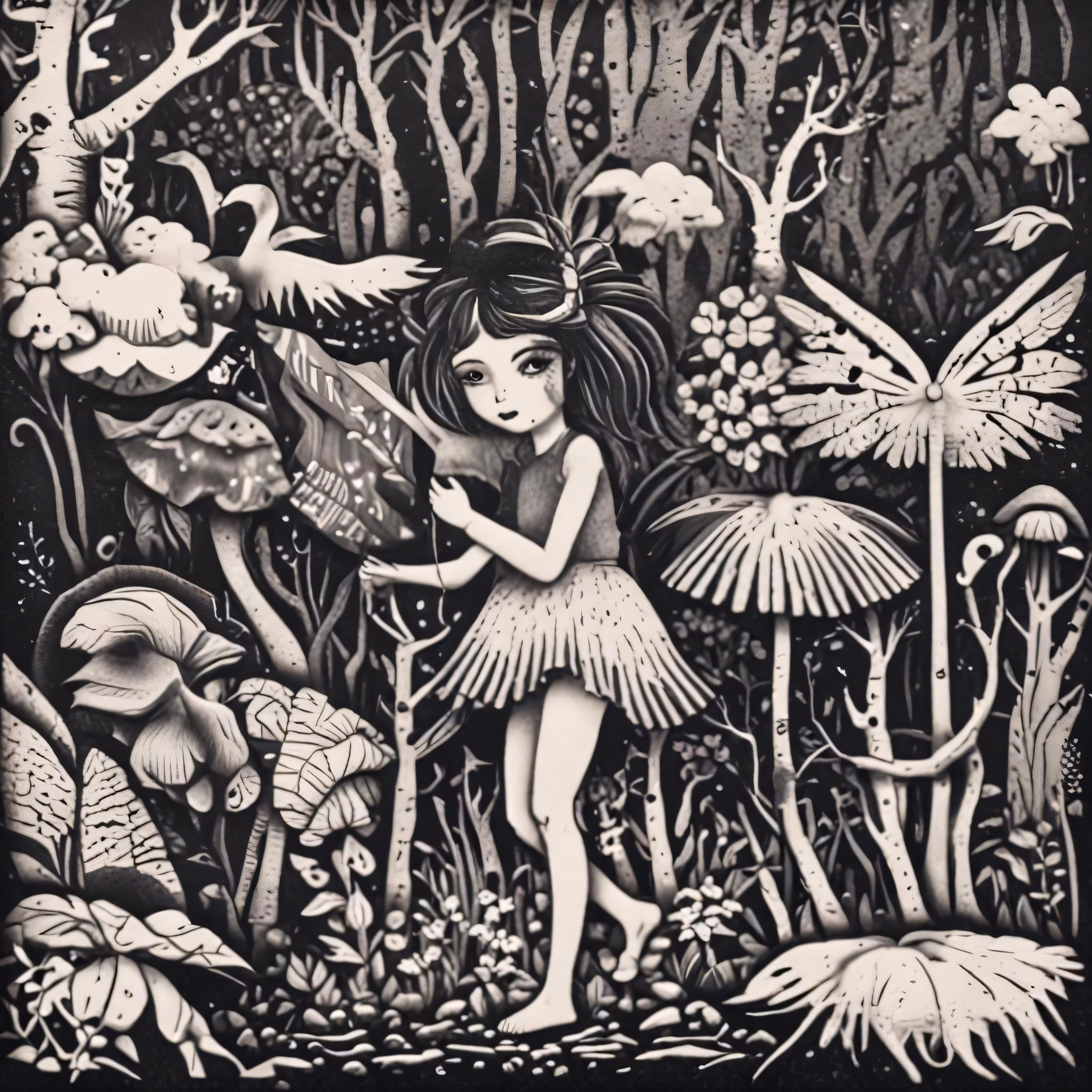 High resolution picture, free to use, an ink drawing of a girl surrounded by mushrooms
