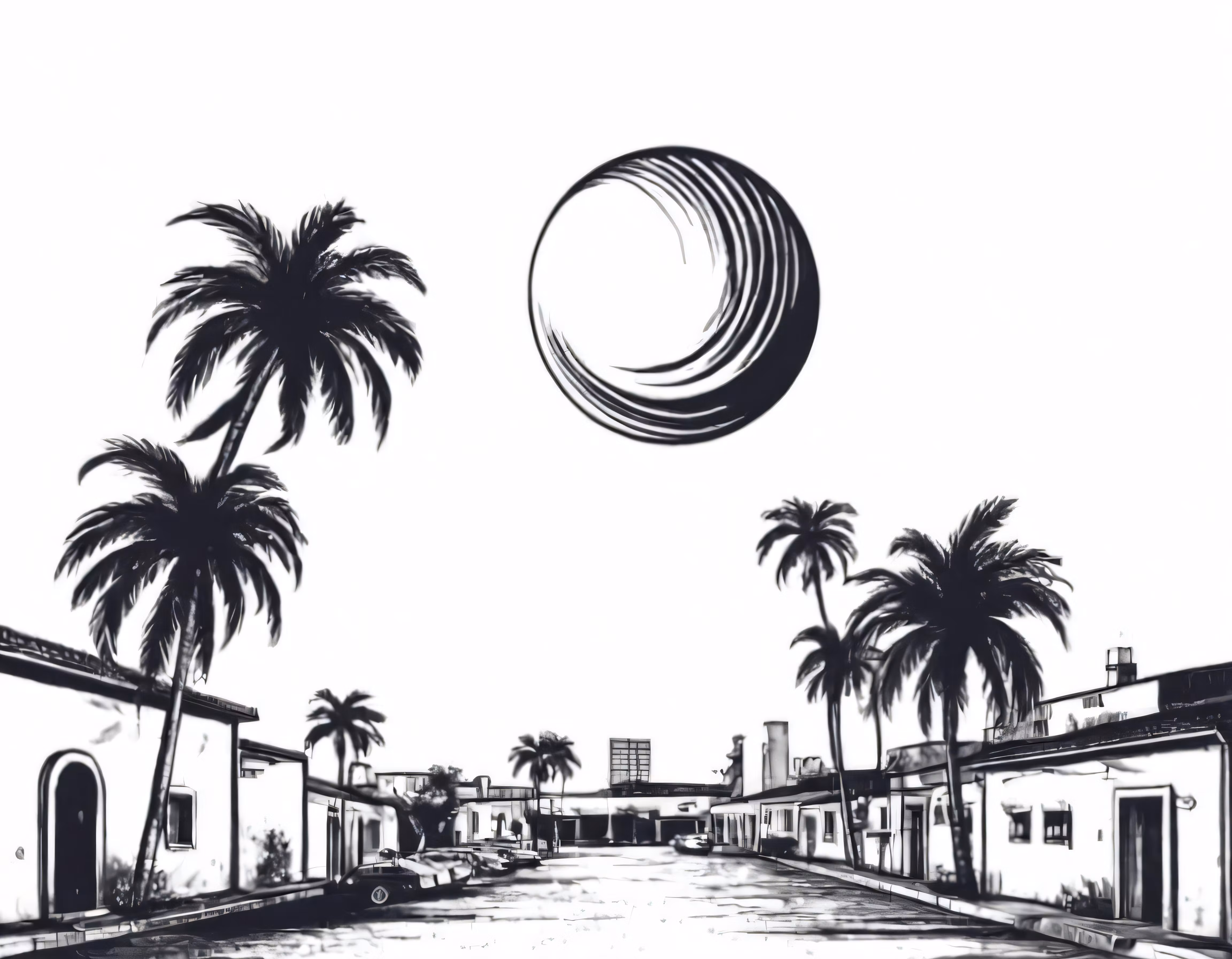 High resolution picture, free to use, an ink drawing of a palm tree lined street