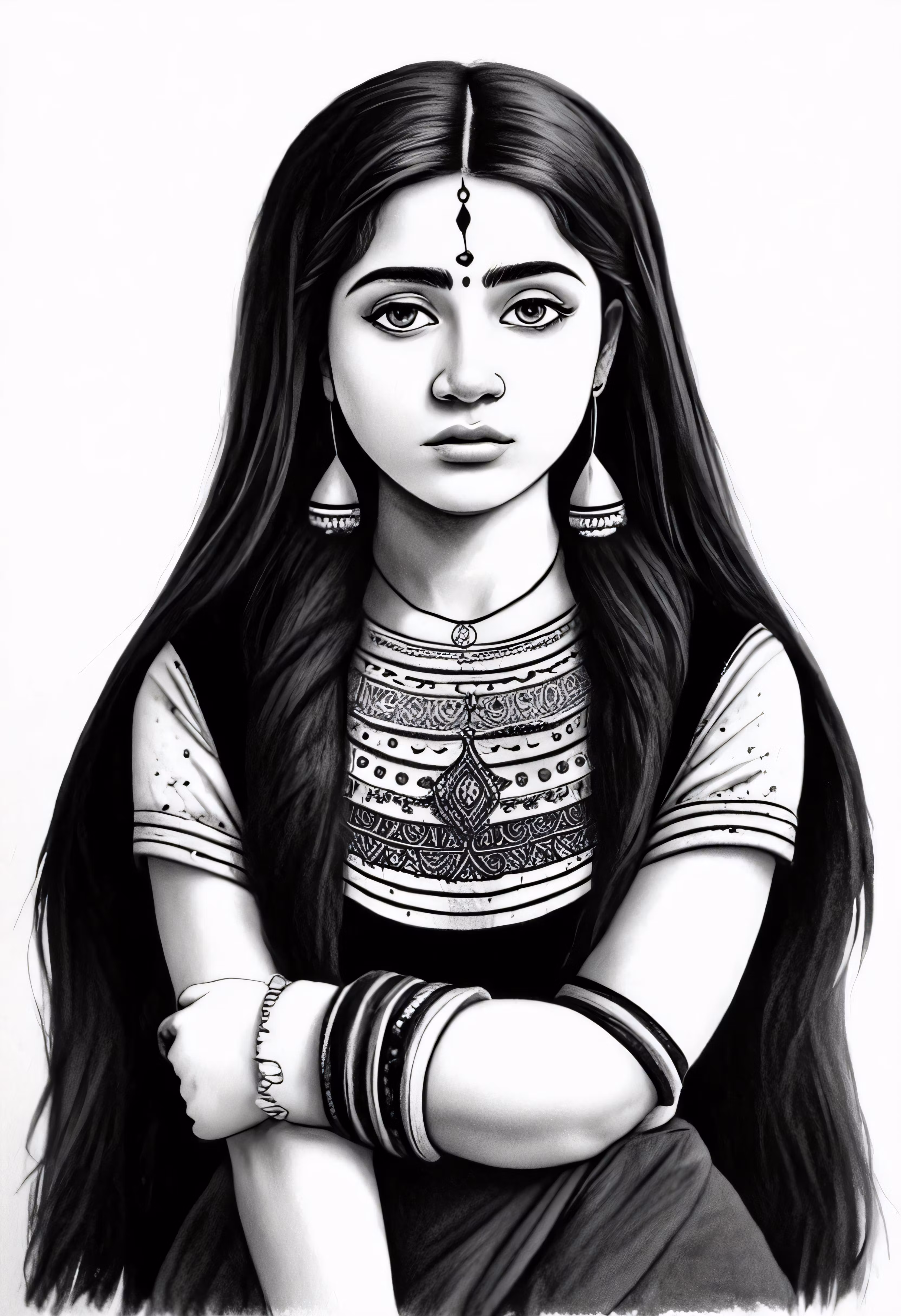 High resolution picture, free to use, an ink painting of a girl wearing jewelry