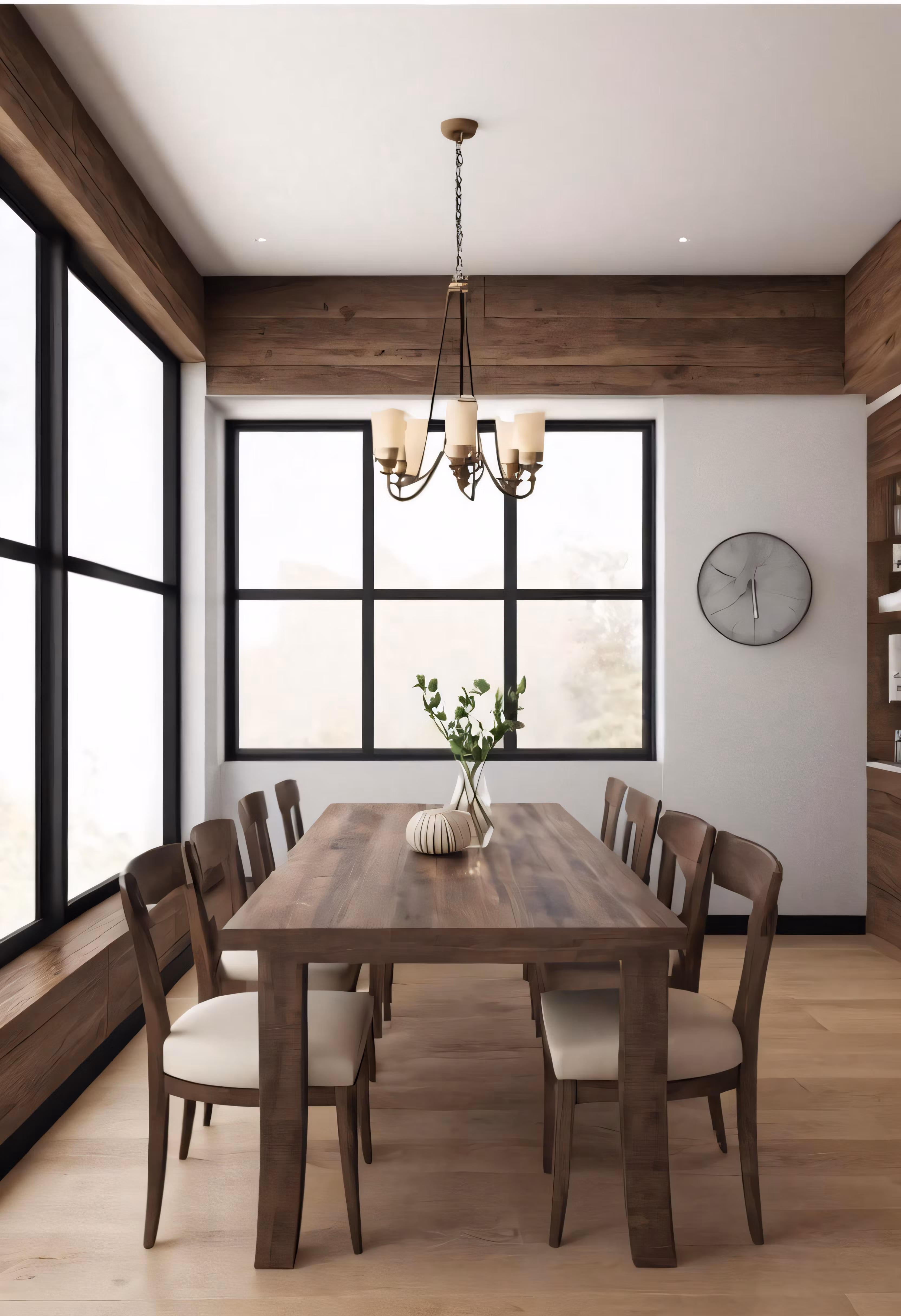 High resolution picture, free to use, an interior shot of a modern dining area with wooden paneling