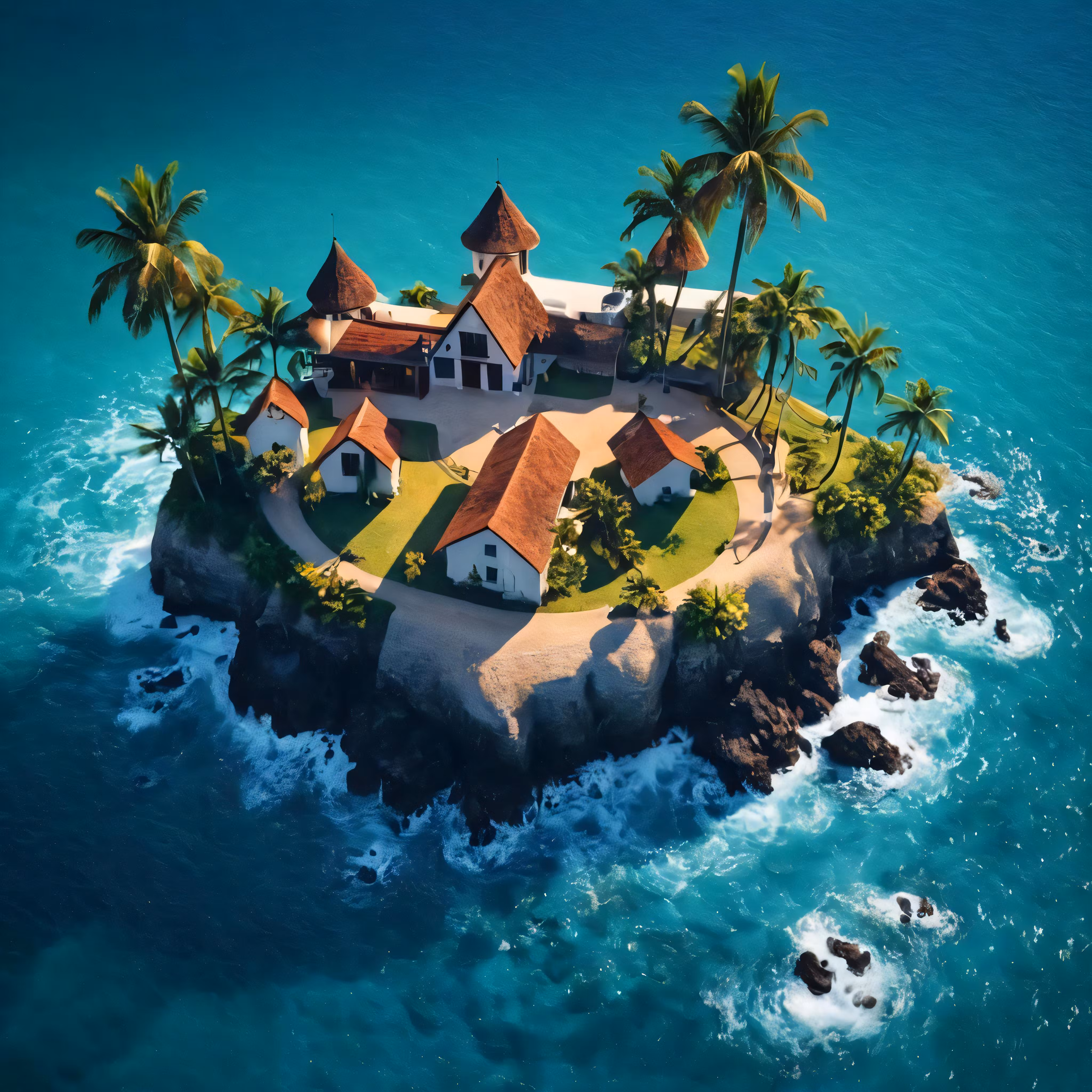 High resolution picture, free to use, an island made out of water with palm trees on top