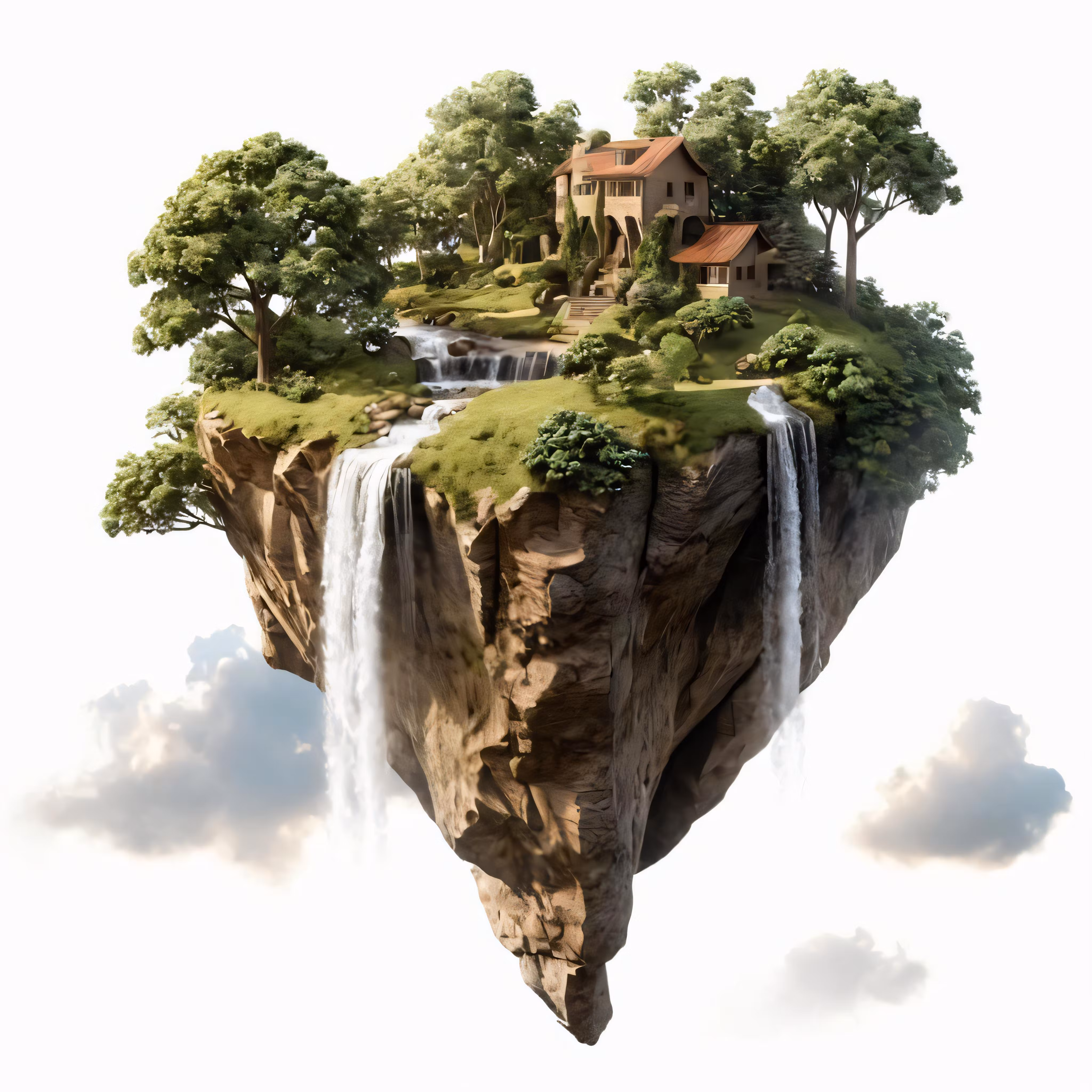 High resolution picture, free to use, an island with houses and waterfall floating in the sky