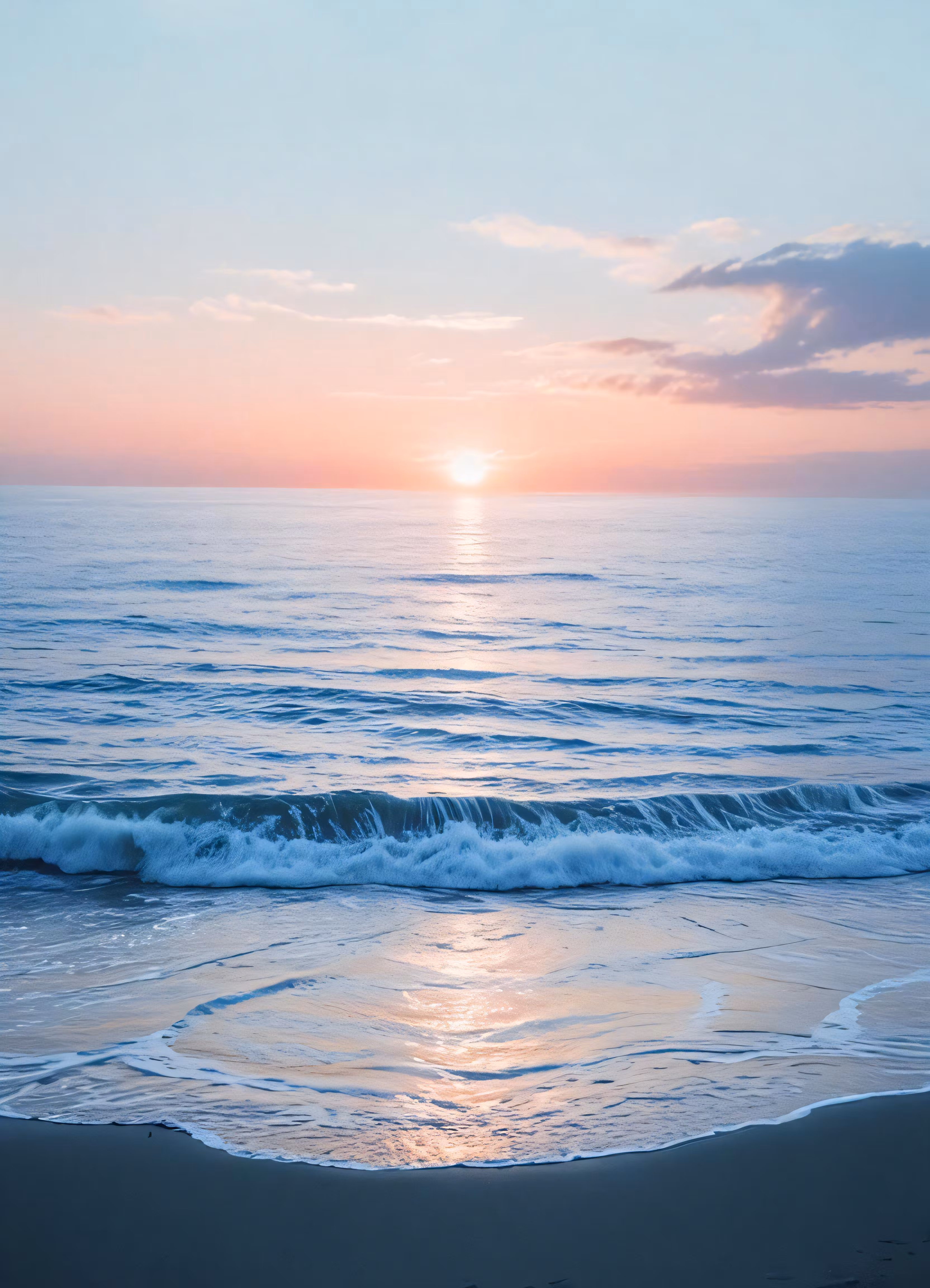 High resolution picture, free to use, an ocean and beach at sunset with the sun shining over the water