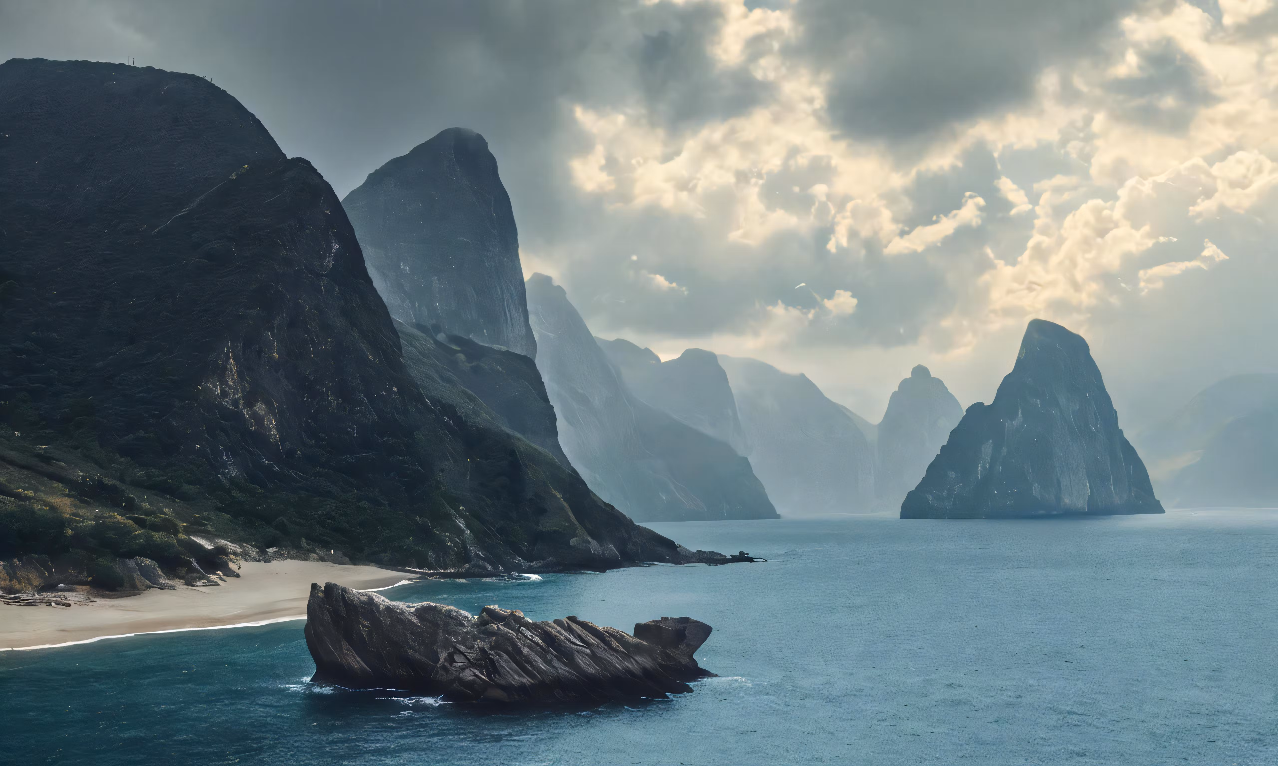 High resolution picture, free to use, an ocean and two mountain side in the background