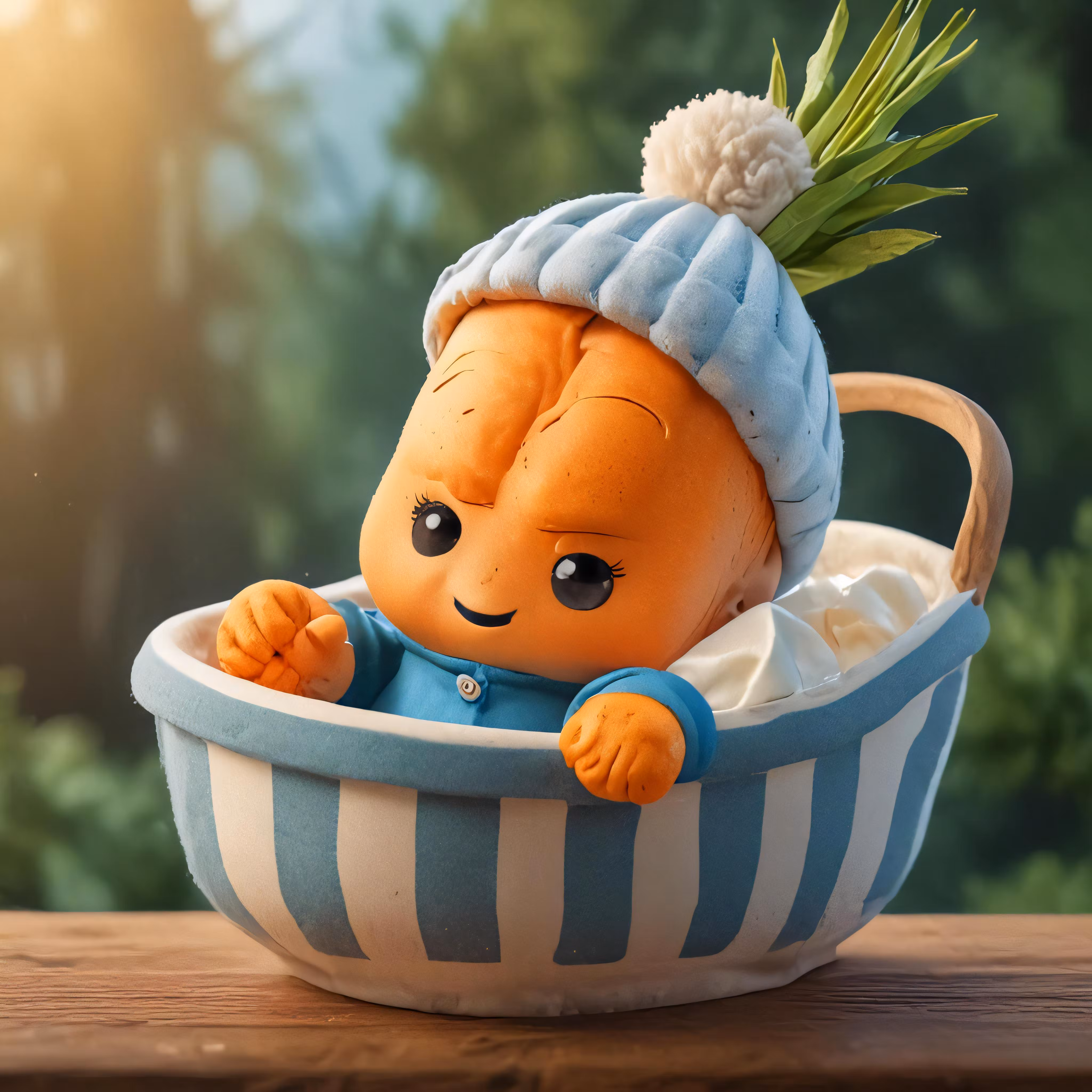 High resolution picture, free to use, an odd looking doll in a blue and white striped bowl