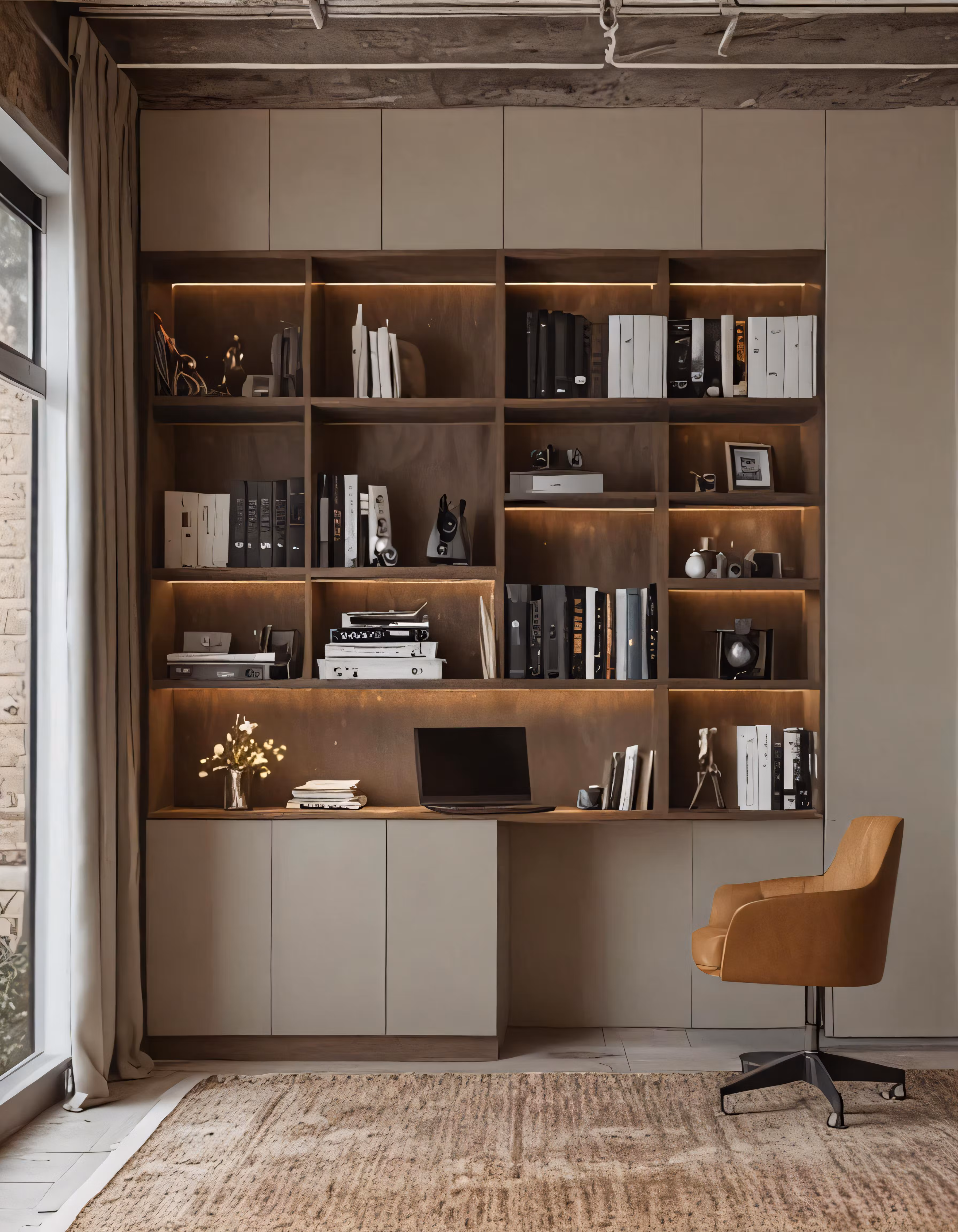 High resolution picture, free to use, an office space is nicely arranged, and has a bookshelf with a laptop on it