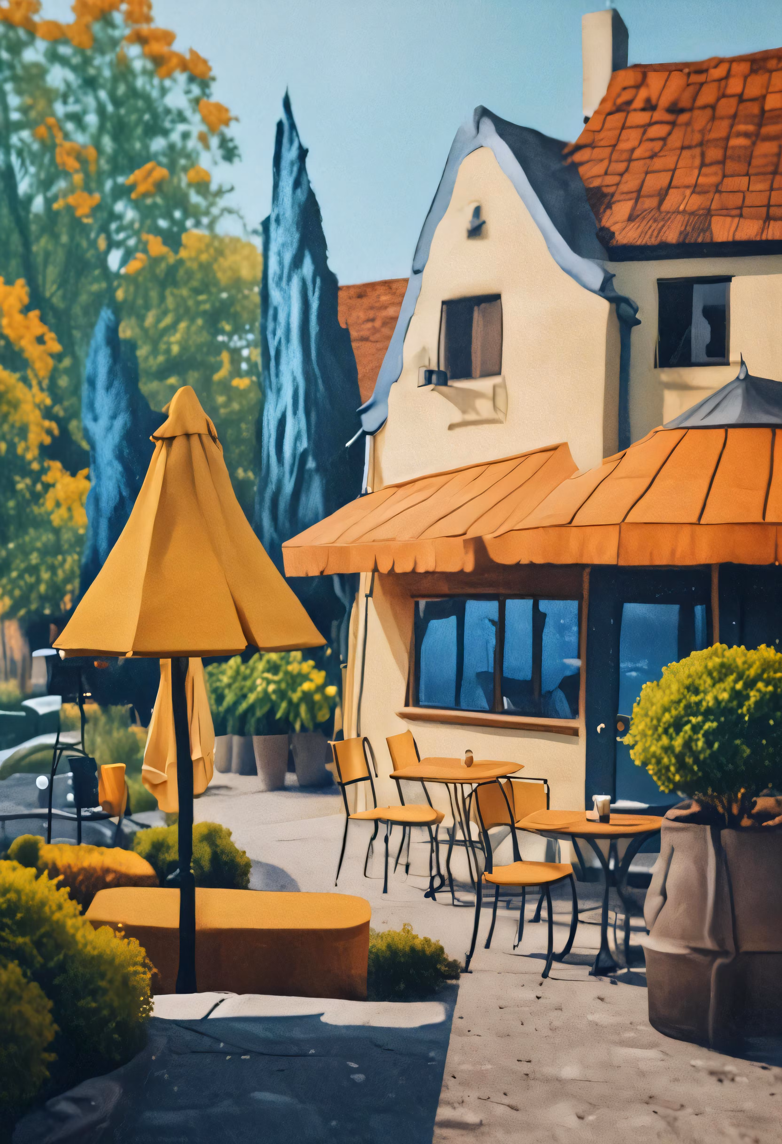 High resolution picture, free to use, an oil painting of a cafe with yellow umbrellas