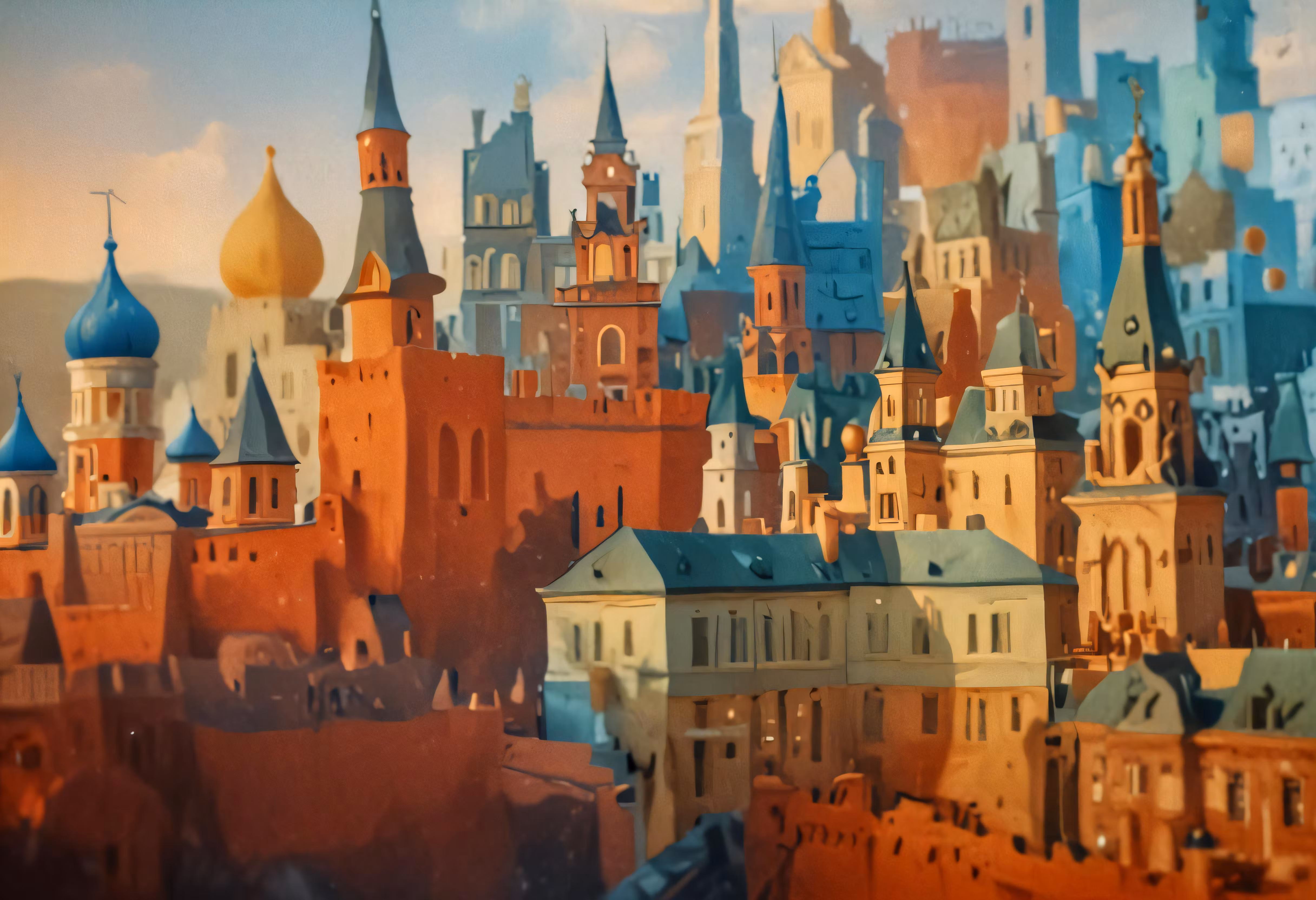 High resolution picture, free to use, an oil painting of a city with towers and spires
