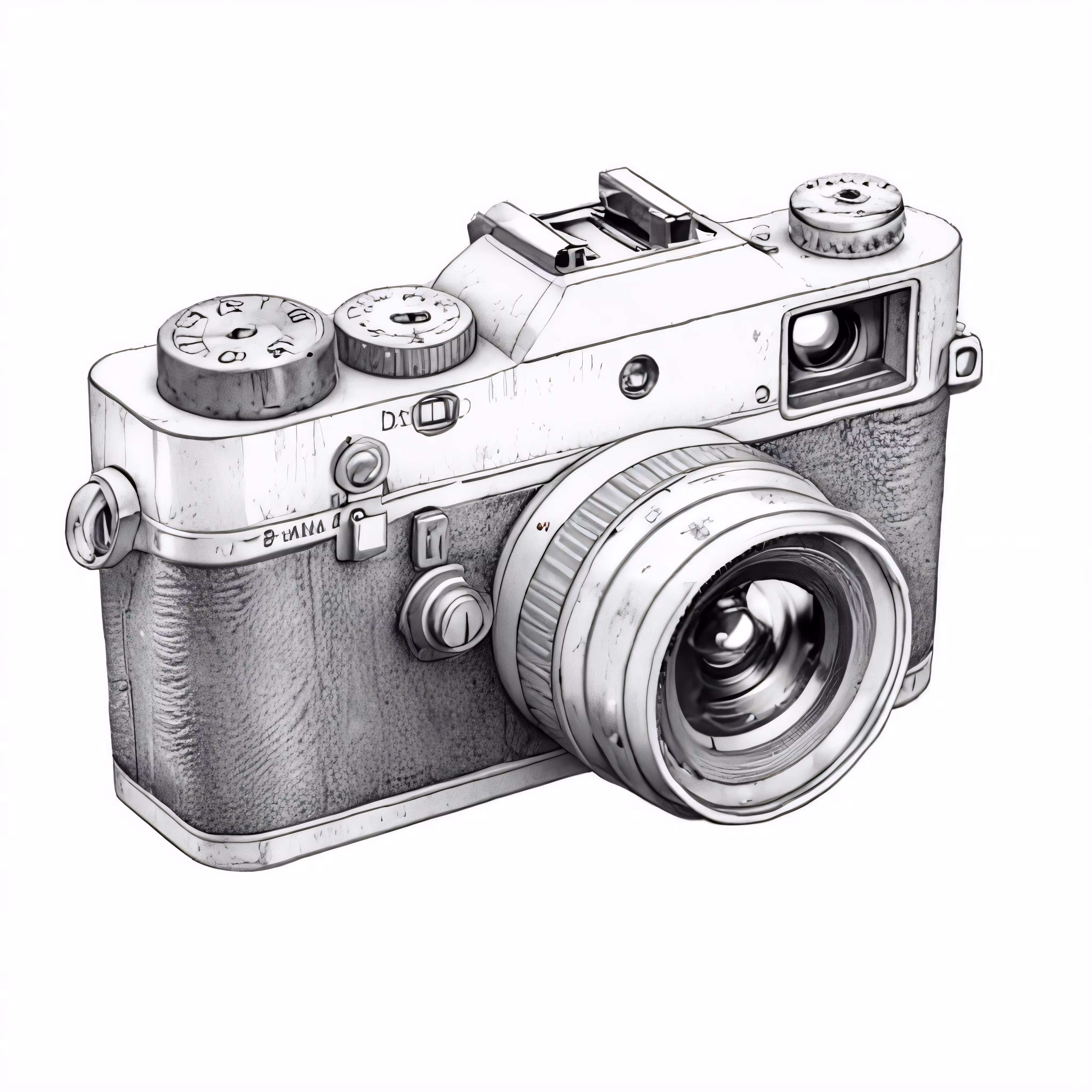 High resolution picture, free to use, an old camera, with the lens facing upward and a black ink painting underneath it