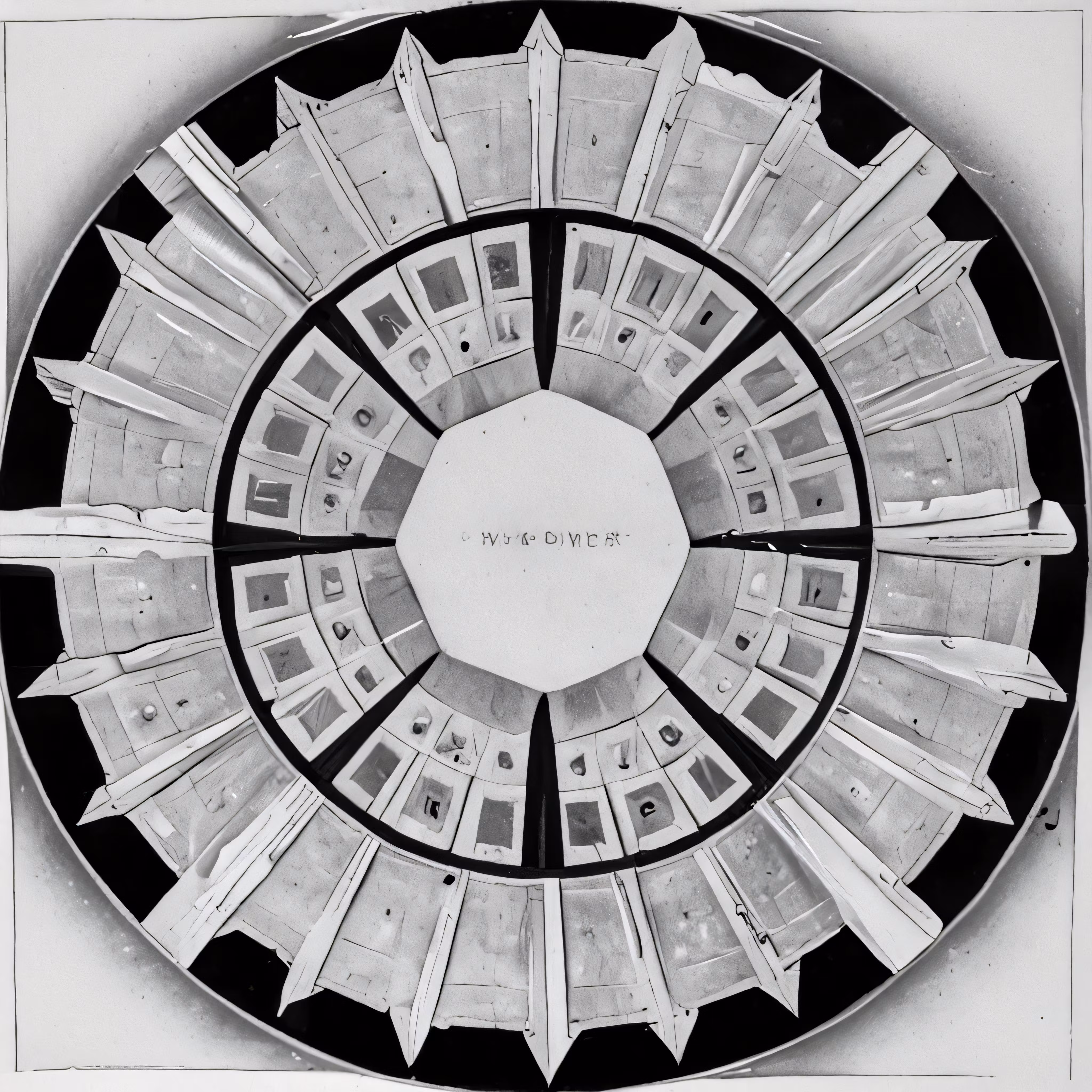High resolution picture, free to use, an old diagram shows a circular structure with several floors