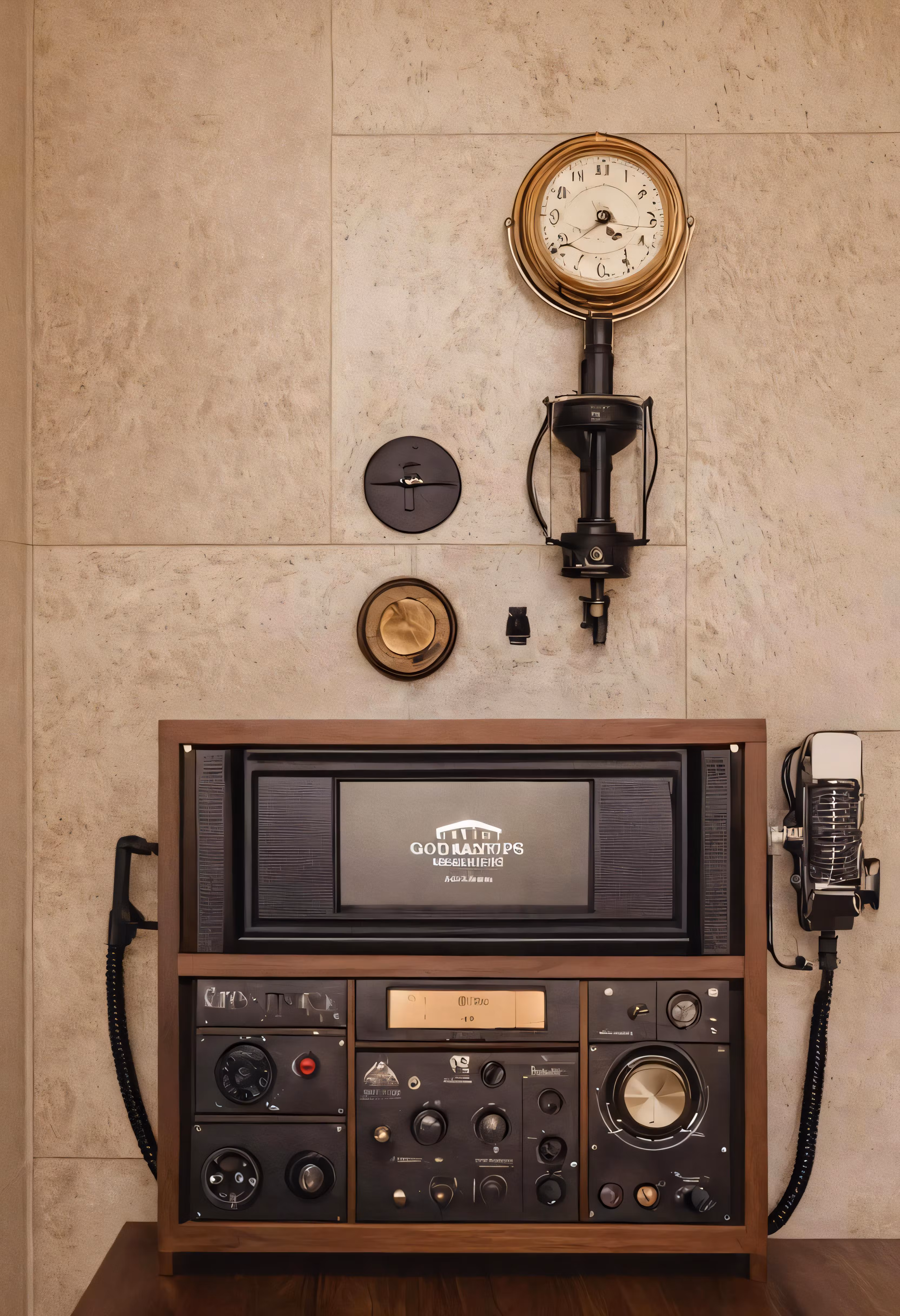 High resolution picture, free to use, an old fashioned clock sitting above some equipment